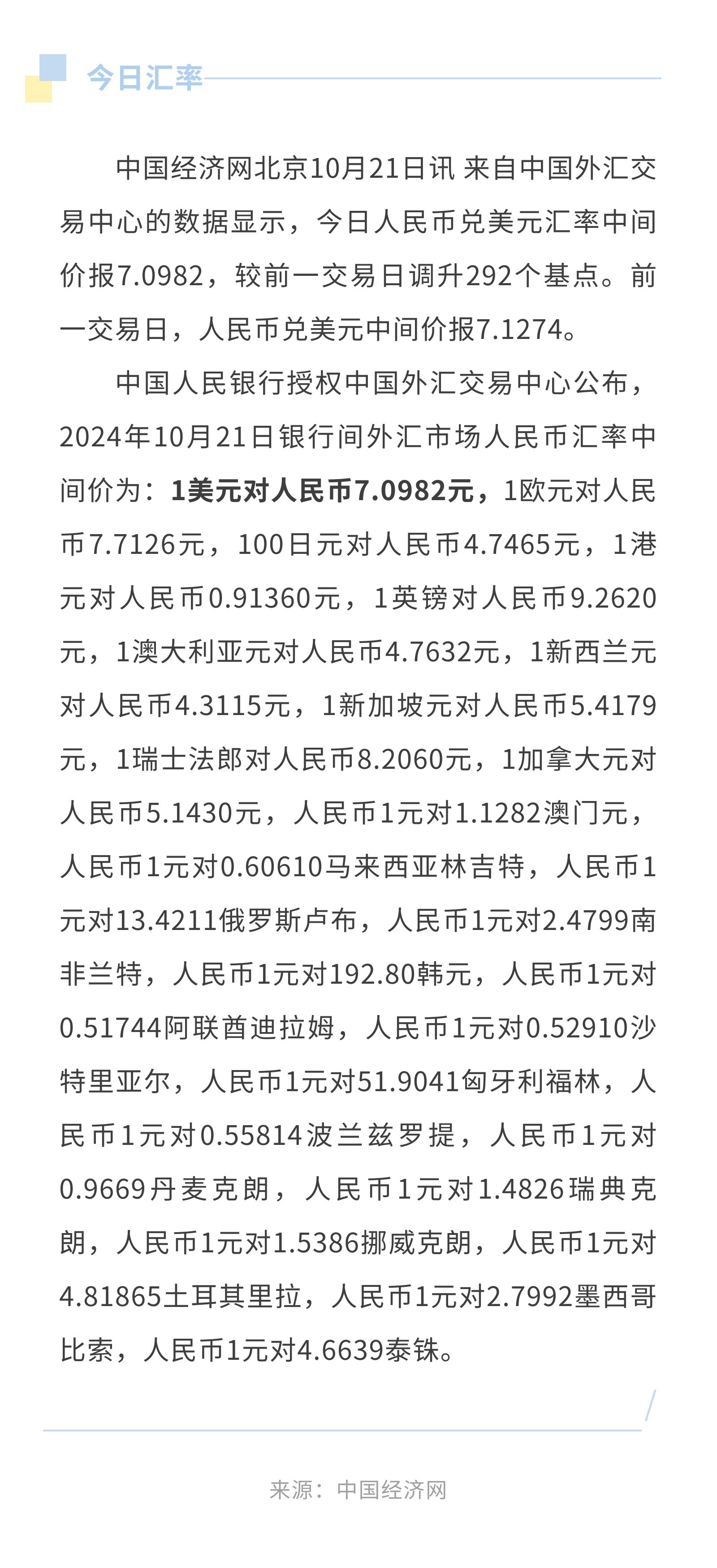 10月21日人民币兑美元中间价报7.0982,调升292个基点