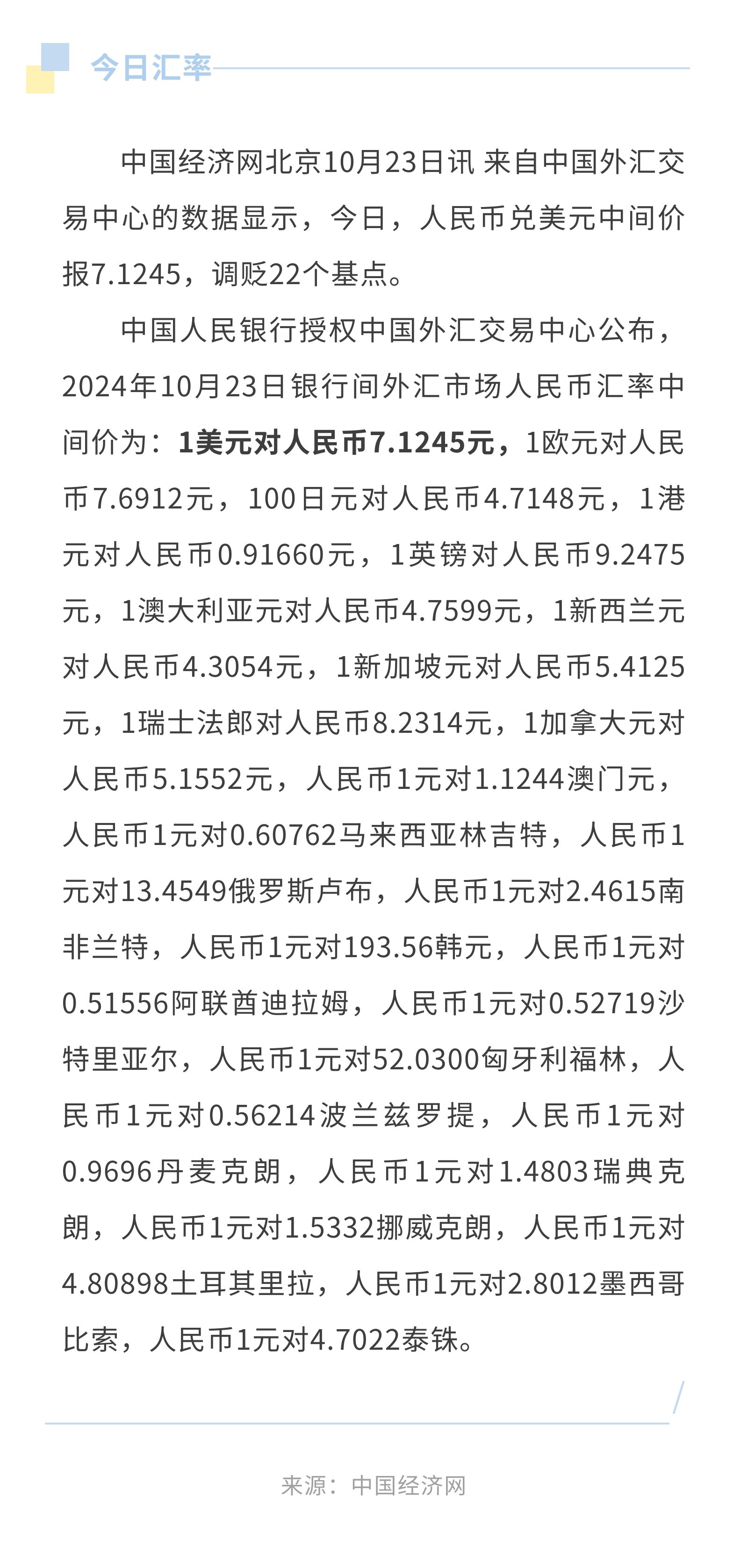 10月23日人民币兑美元中间价报7.1245,调贬22个基点
