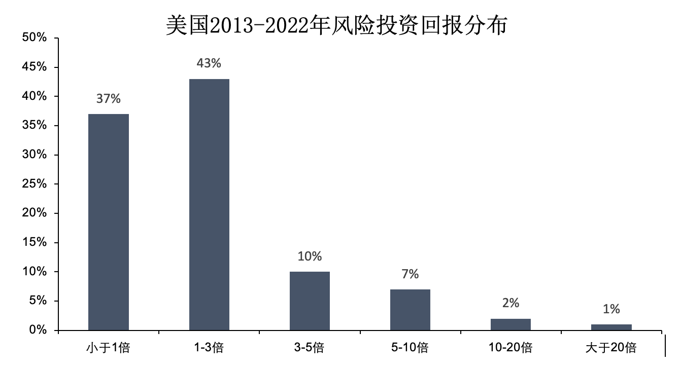 二是不确定性高。科技研发本身是高风险的领域。以CorrelationVentures统计的2013-2022年的美国风险投资机构的情况为例,小于1倍回报的投资项目,占总投资额的37%,1-3倍回报的项目占总投资额的43%,3倍以上回报的项目占20%,其中,20倍以上超额回报项目仅占1%。也就是说,对科技行业的投资,近四成的项目金额都是要亏本的。