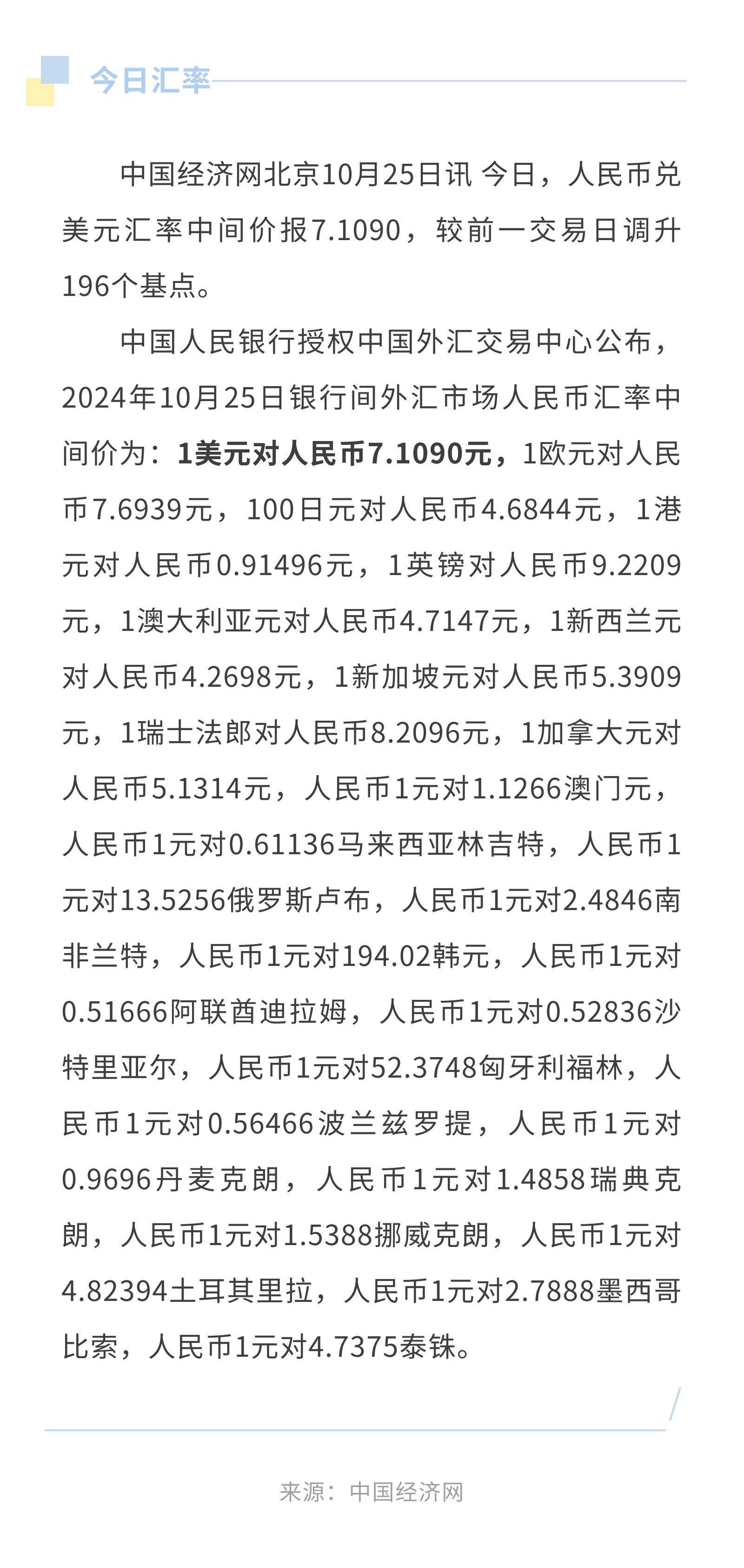 10月25日人民币兑美元中间价报7.1090,调升196个基点