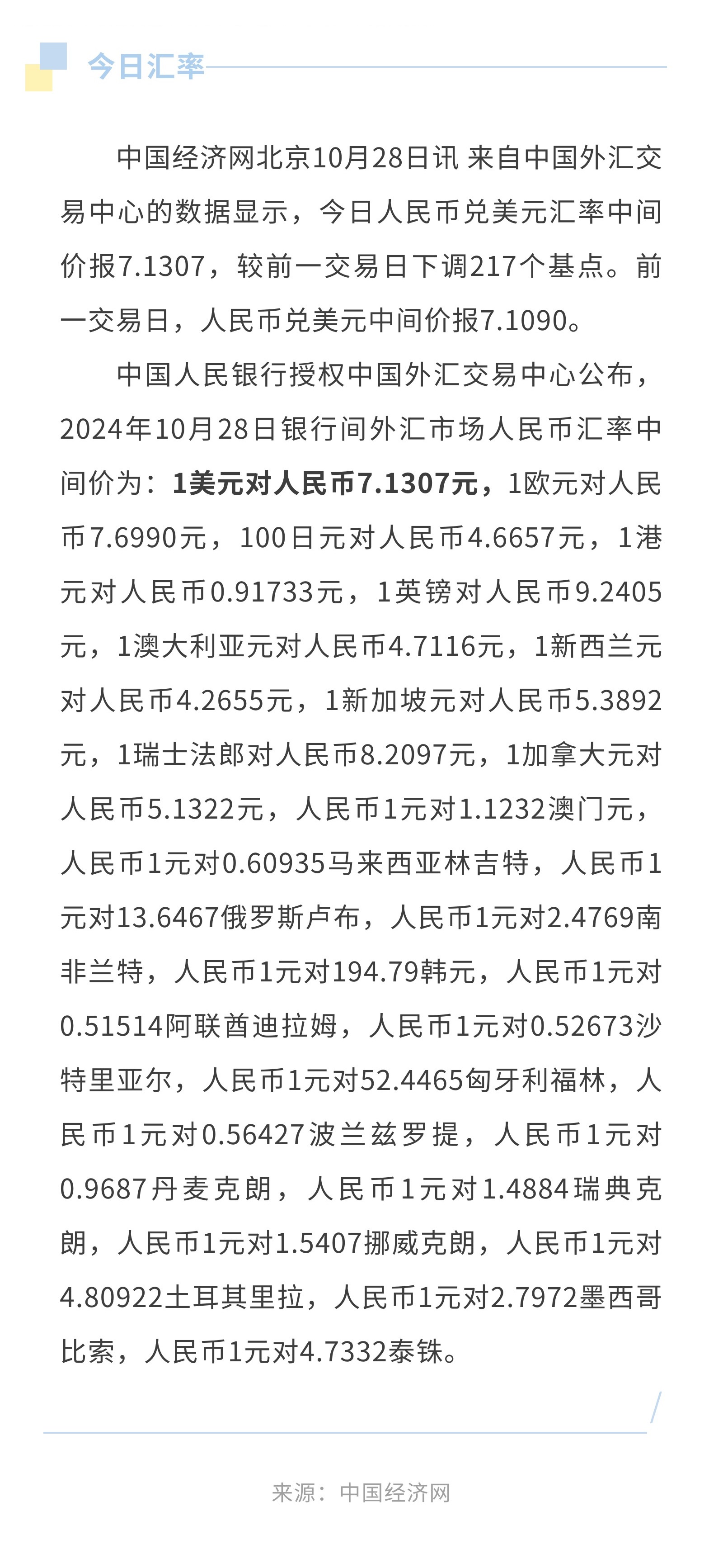 10月28日人民币兑美元中间价报7.1307,下调217个基点