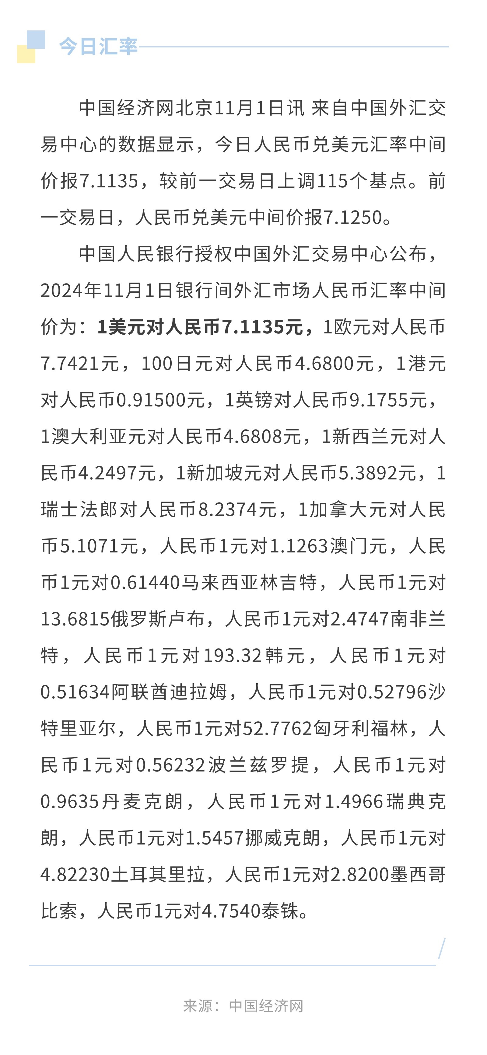 11月1日人民币兑美元中间价报7.1135,上调115个基点