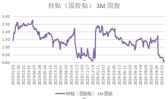 10月30日,3月期国股票据转贴利率下行至0.01%,一度接近于0,当天3月期城商票据转贴利率亦下至0.12%的低位。
