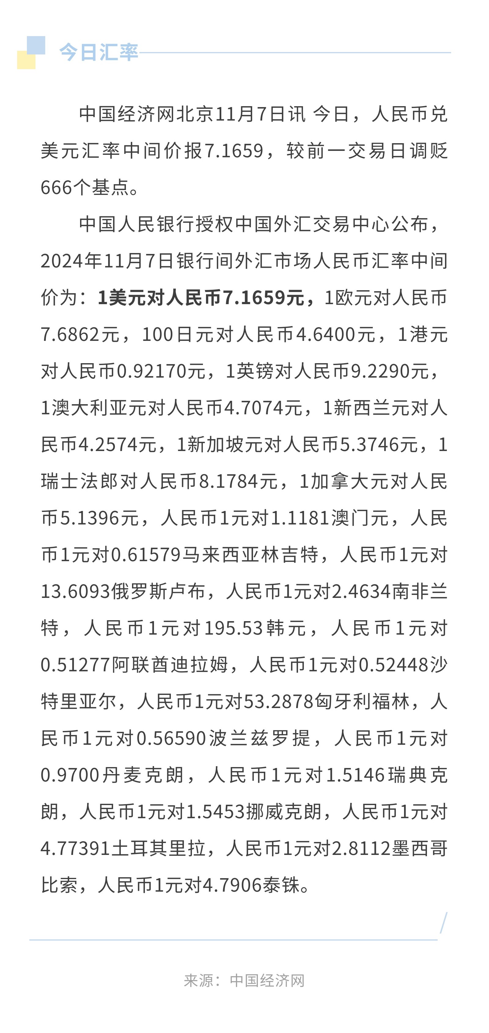 1月7日人民币兑美元中间价报7.1659,调贬666个基点