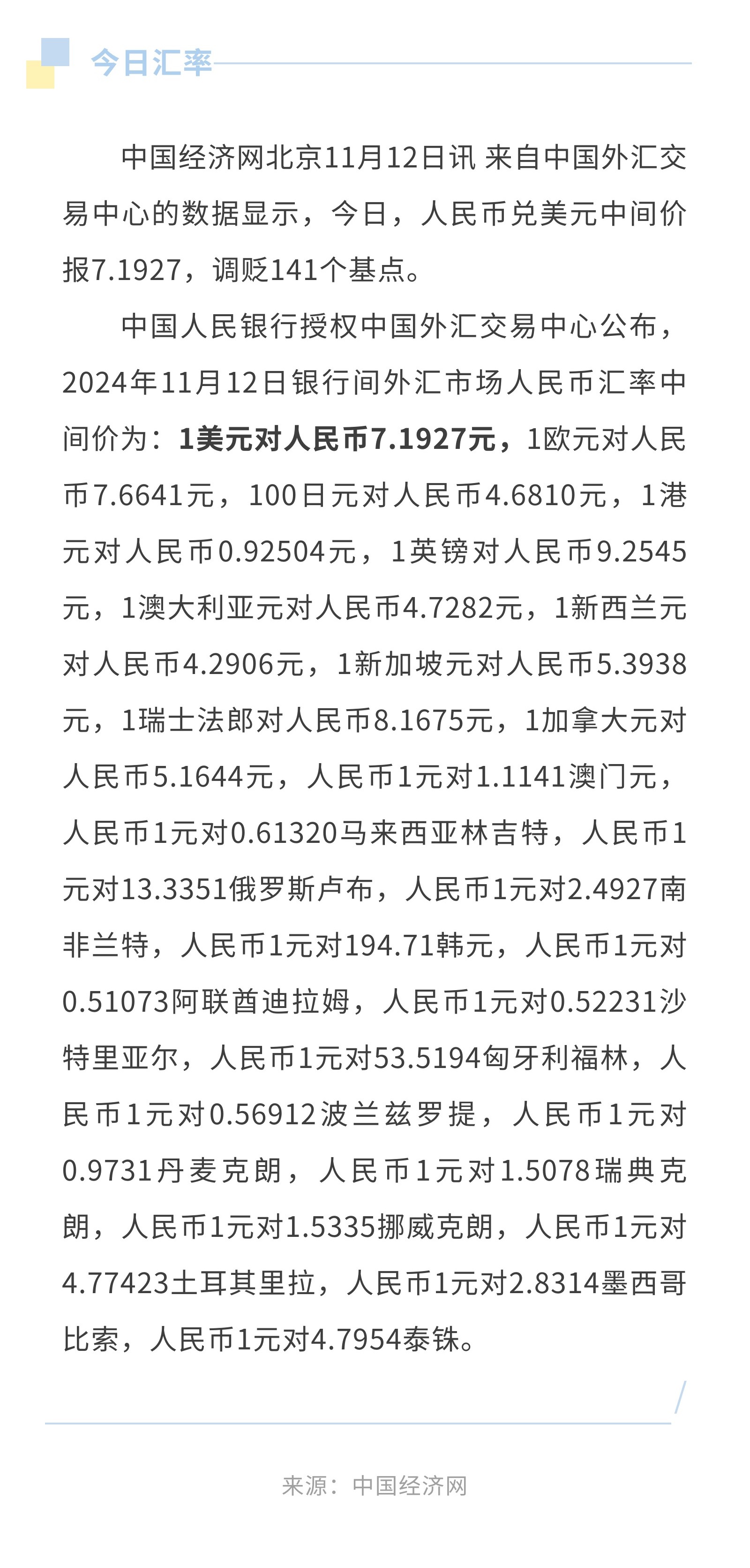 11月12日人民币兑美元中间价报7.1927,调贬141个基点