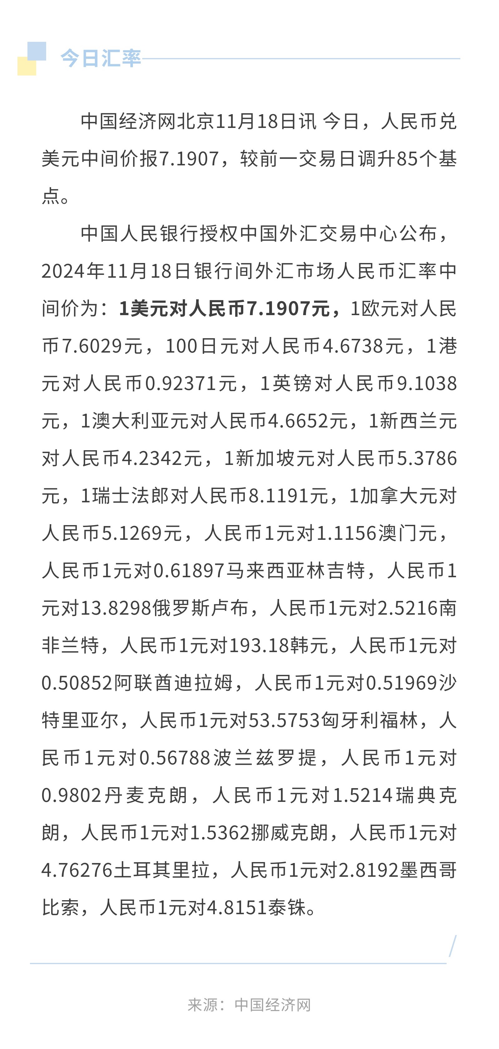 11月18日人民币兑美元中间价报7.1907,调升85个基点