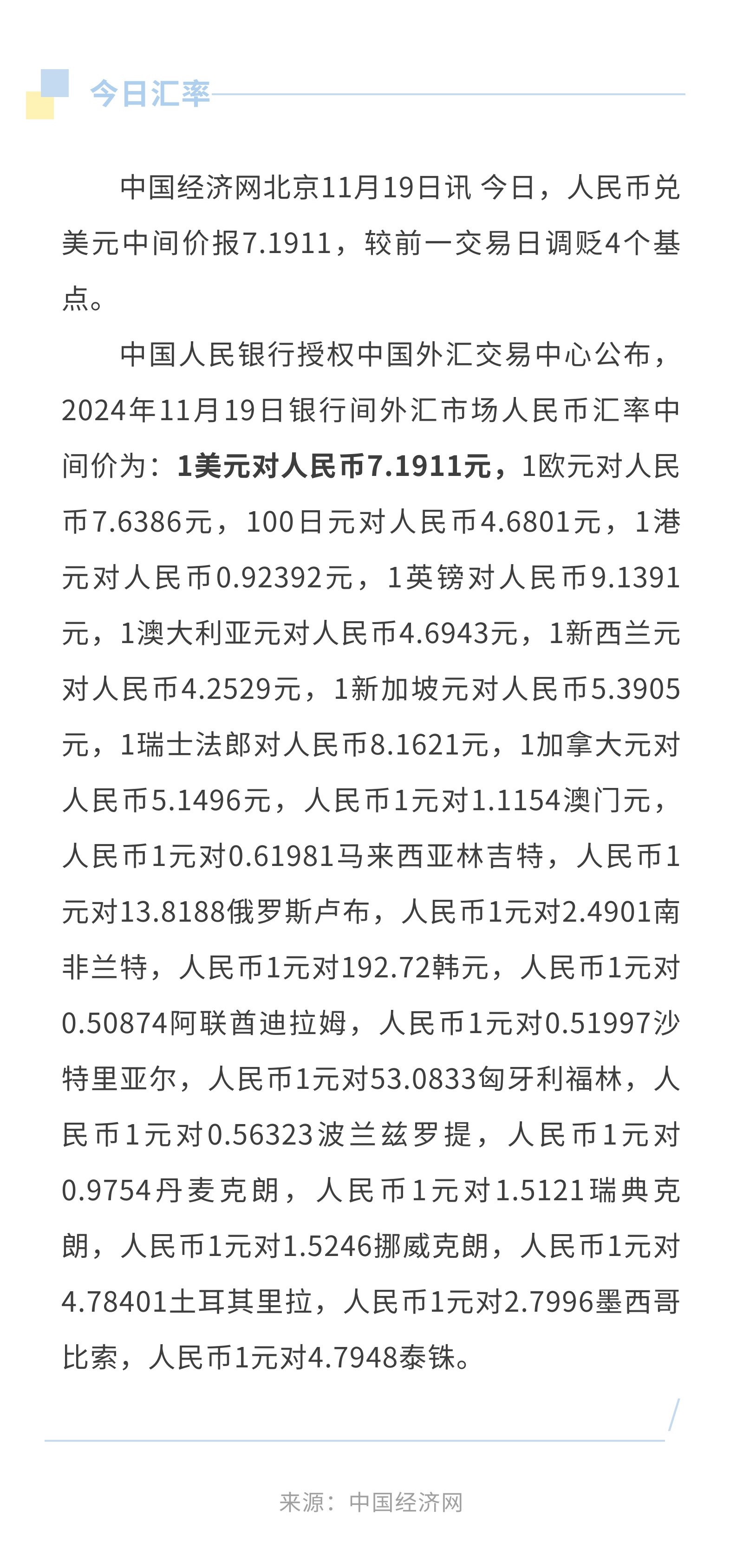 11月19日人民币兑美元中间价报7.1911,调贬4个基点