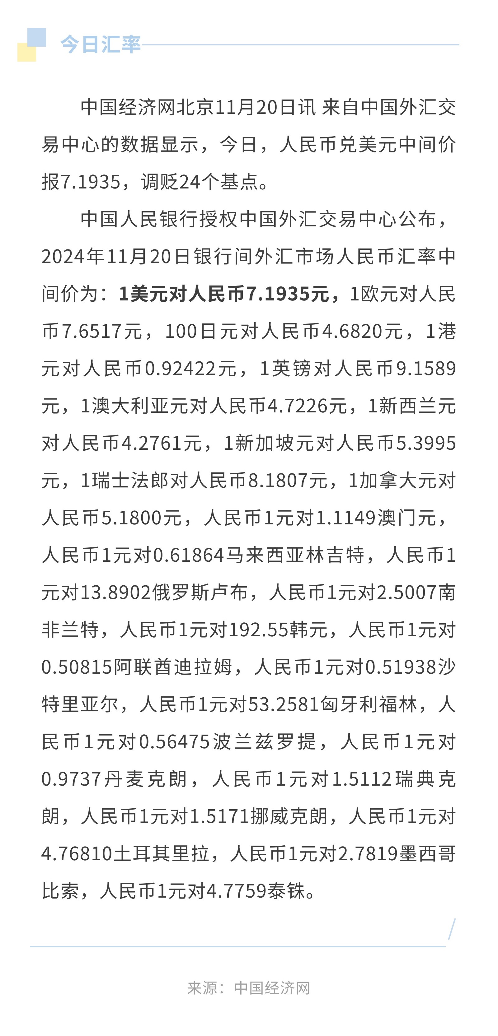 11月20日人民币兑美元中间价报7.1935,调贬24个基点