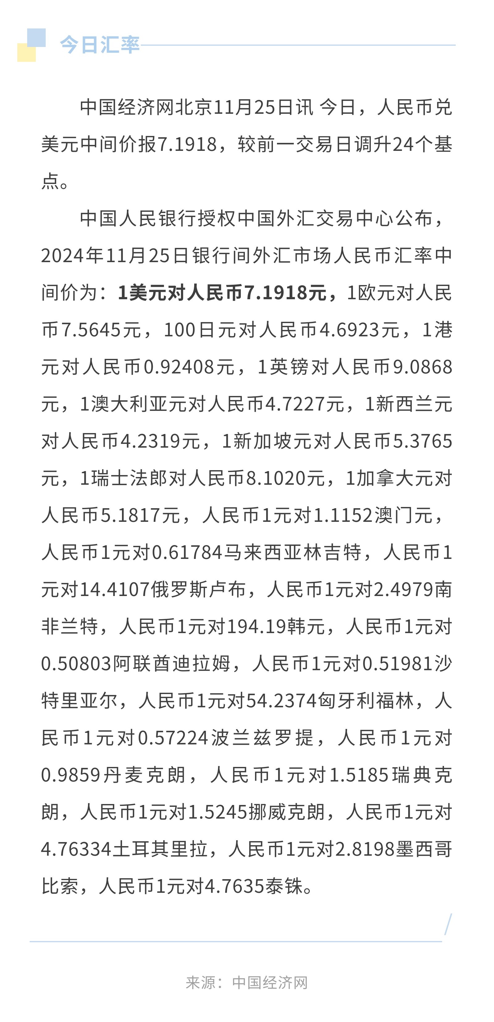 11月25日人民币兑美元中间价报7.1918,调升24个基点