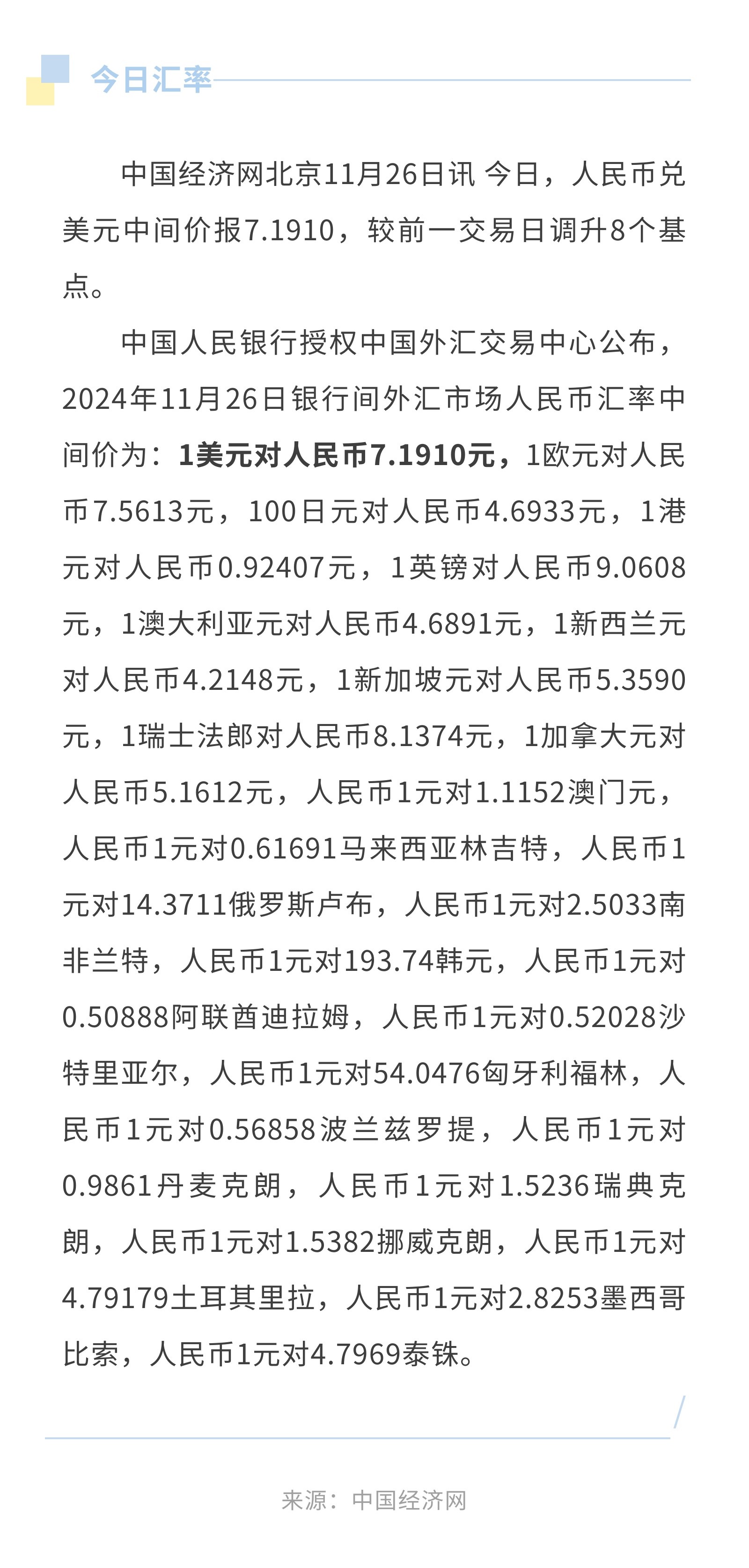 11月26日人民币兑美元中间价报7.1910,调升8个基点
