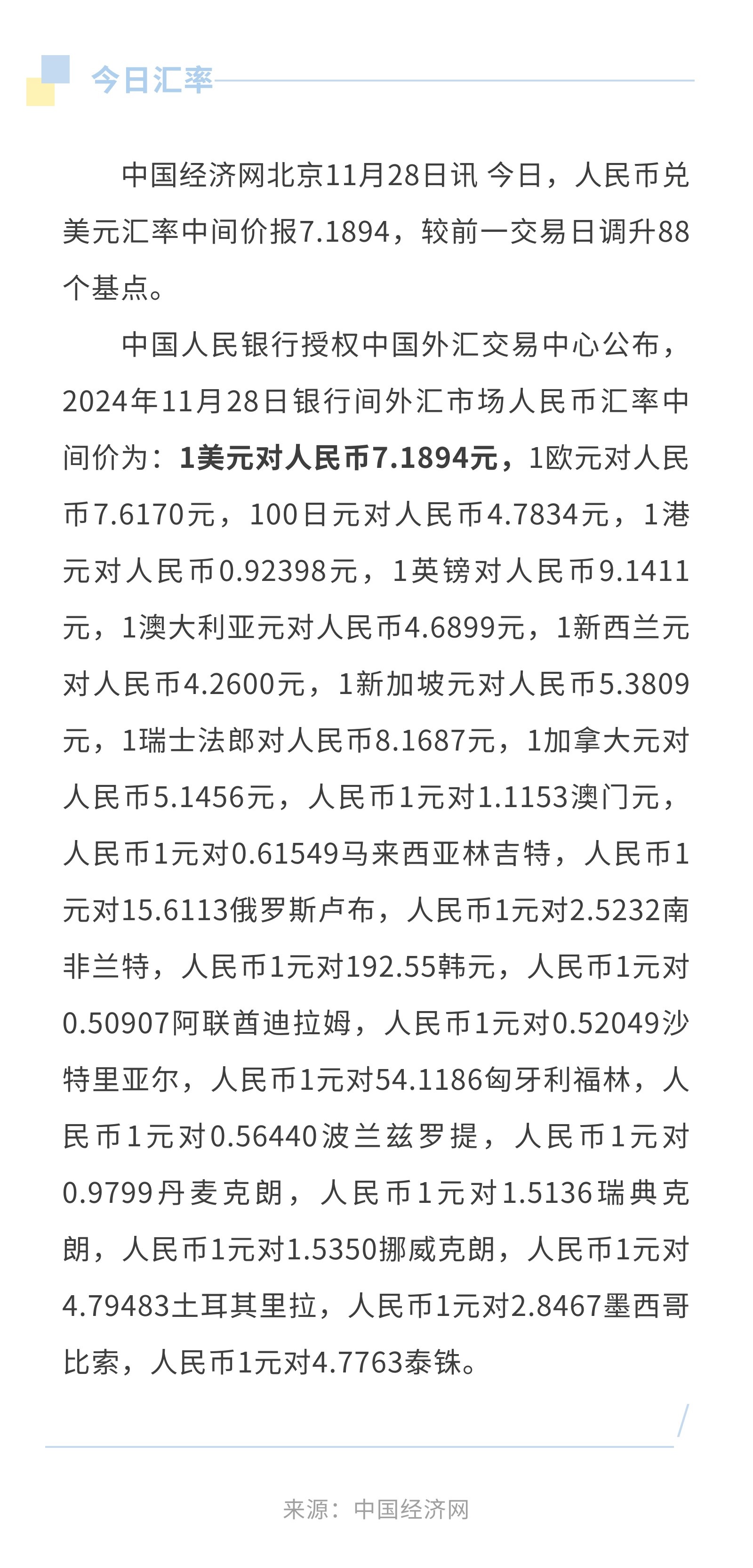 11月28日人民币兑美元中间价报7.1894,调升88个基点