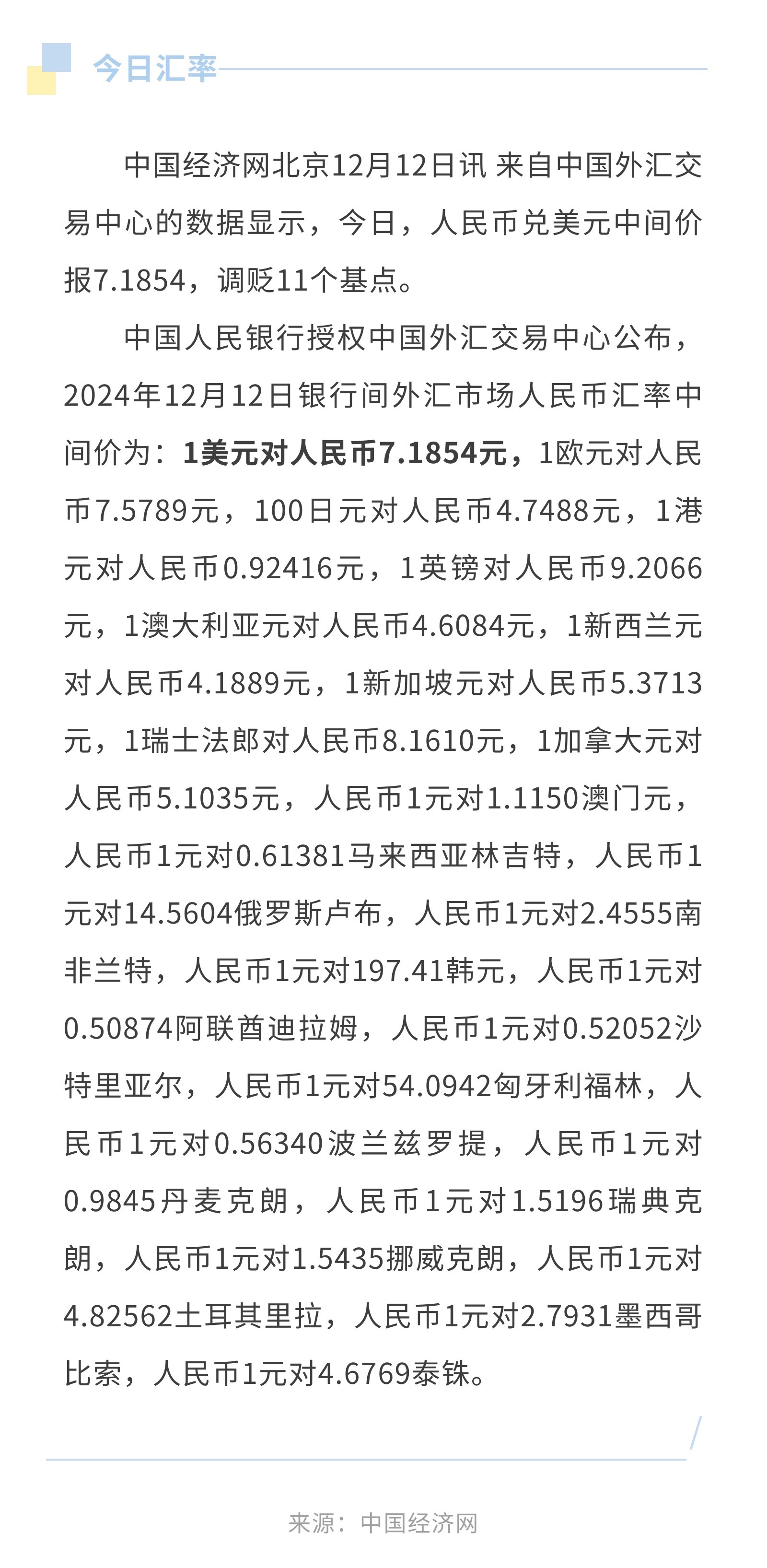 12月12日人民币兑美元中间价报7.1854,调贬11个基点