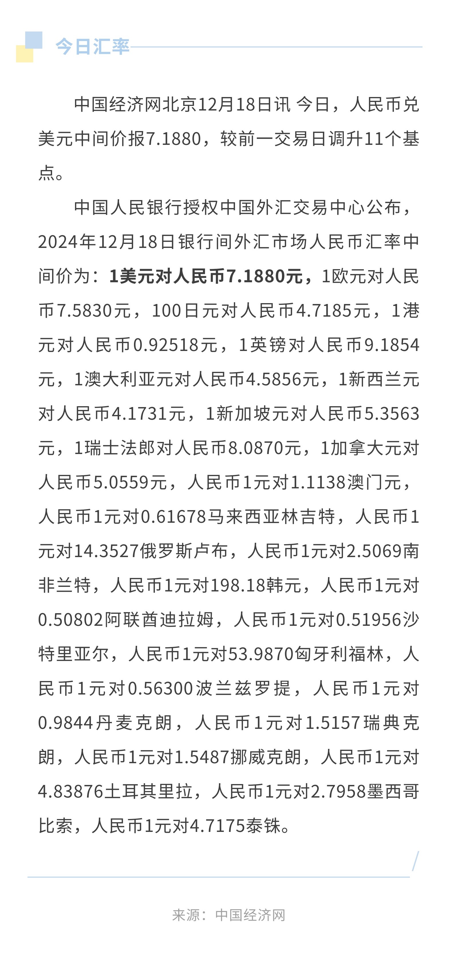 12月18日人民币兑美元中间价报7.1880,调升11个基点