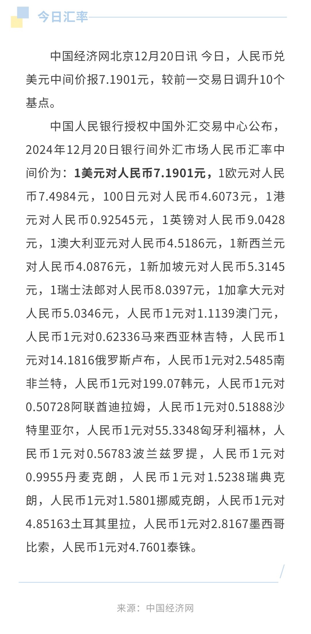 12月20日人民币兑美元中间价报7.1901,调升10个基点
