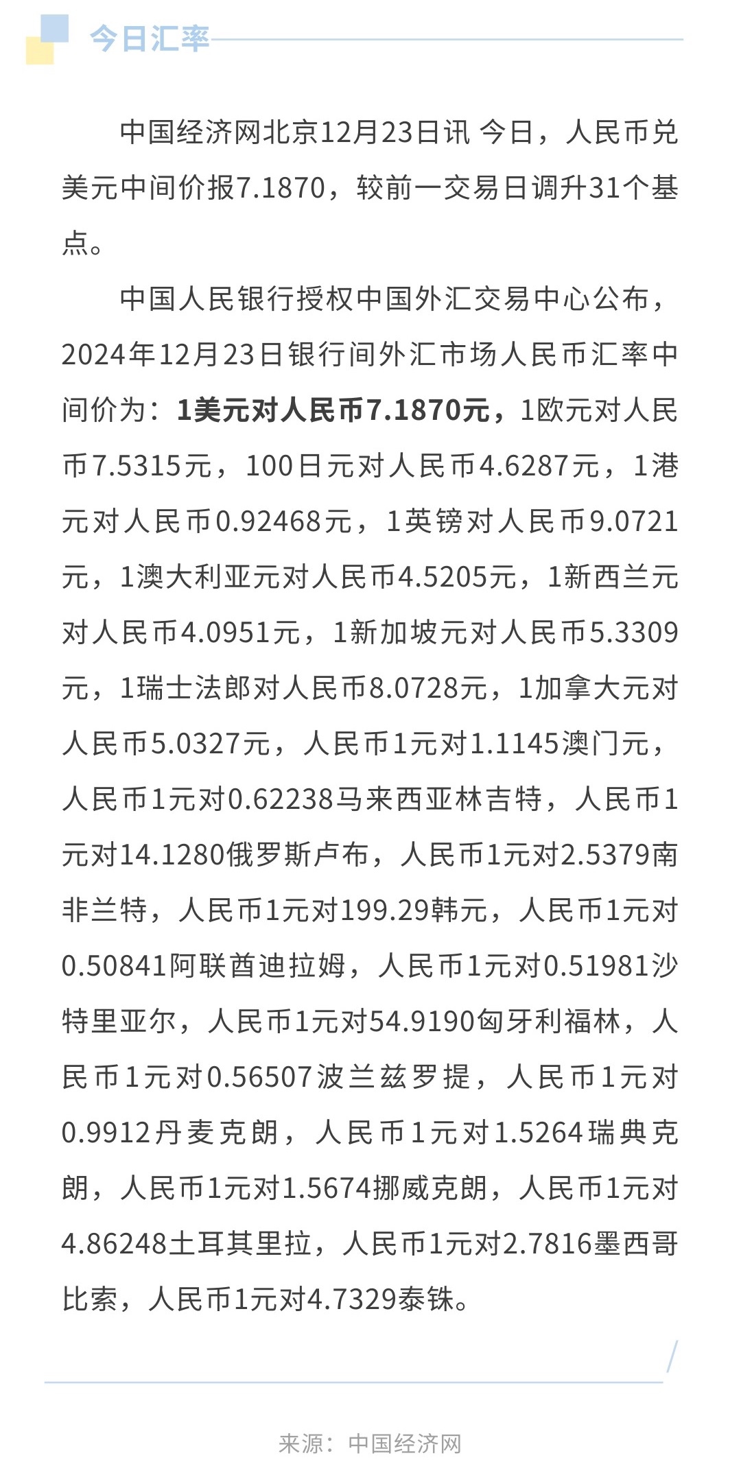 12月23日人民币兑美元中间价报7.1870,调升31个基点
