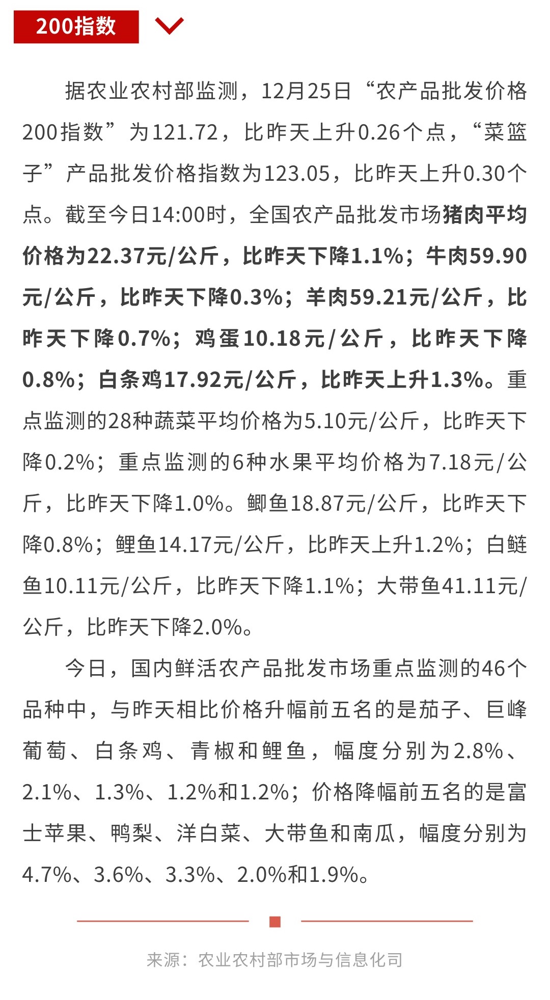 12月25日“农产品批发价格200指数”比昨天上升0.26个点