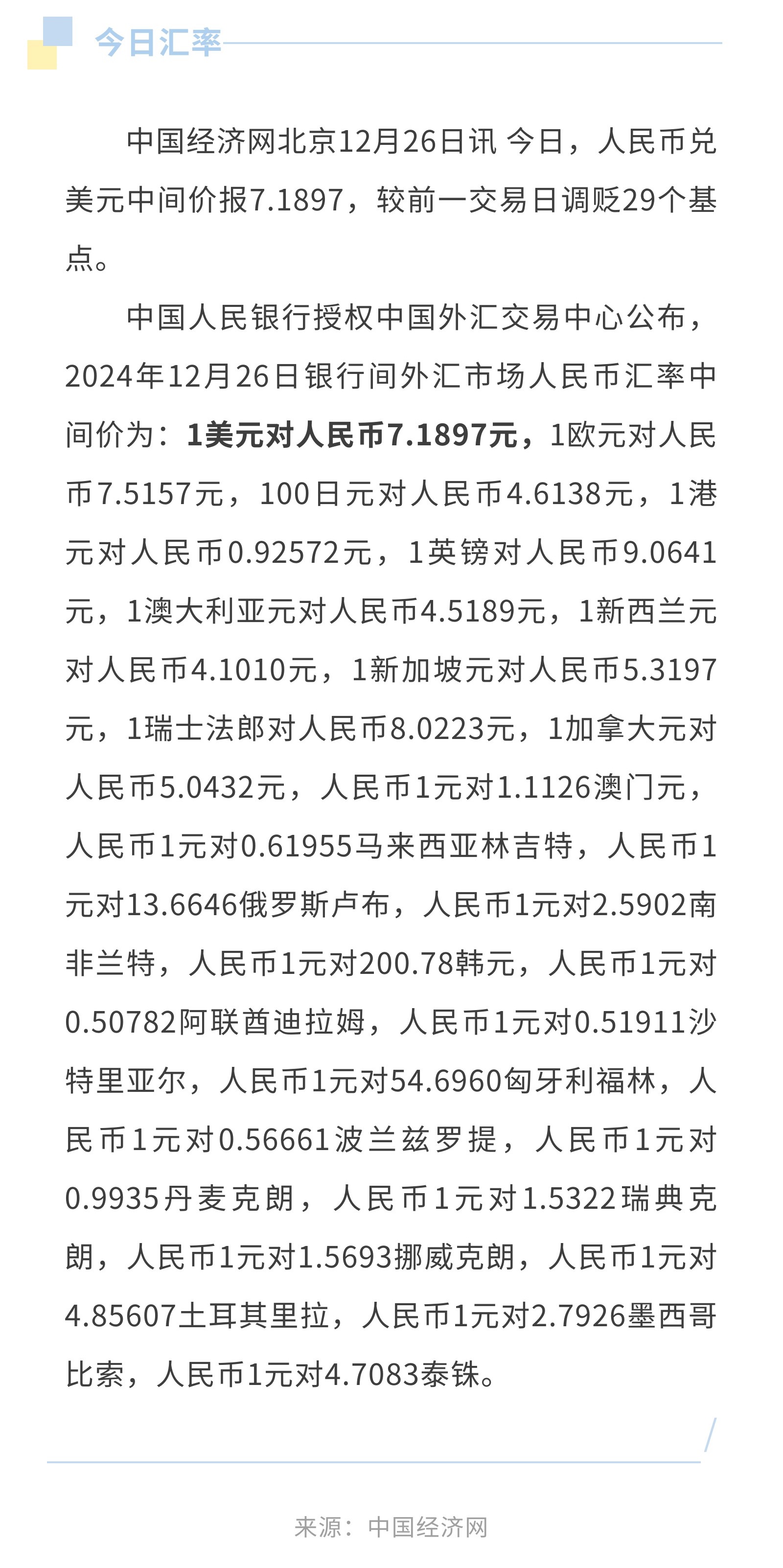12月26日人民币兑美元中间价报7.1897,调贬29个基点