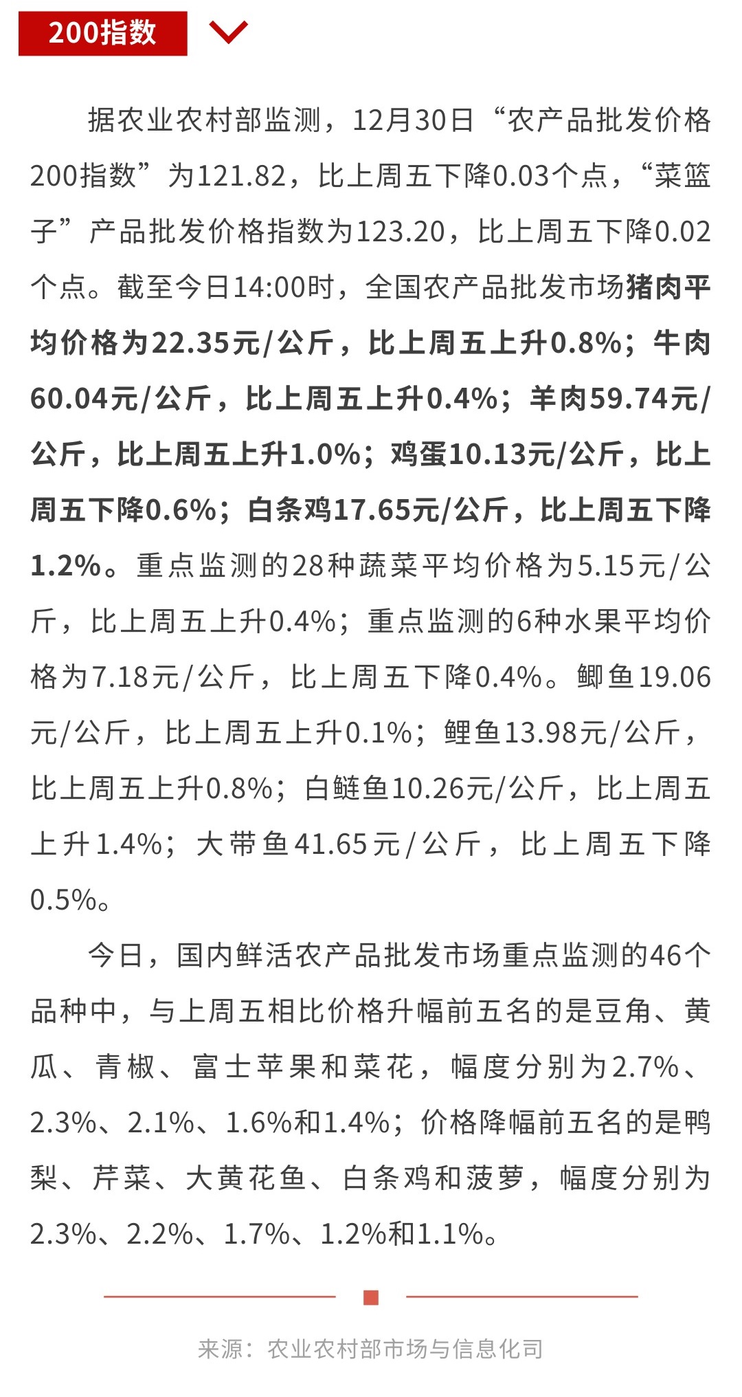 12月30日“农产品批发价格200指数”比上周五下降0.03个点