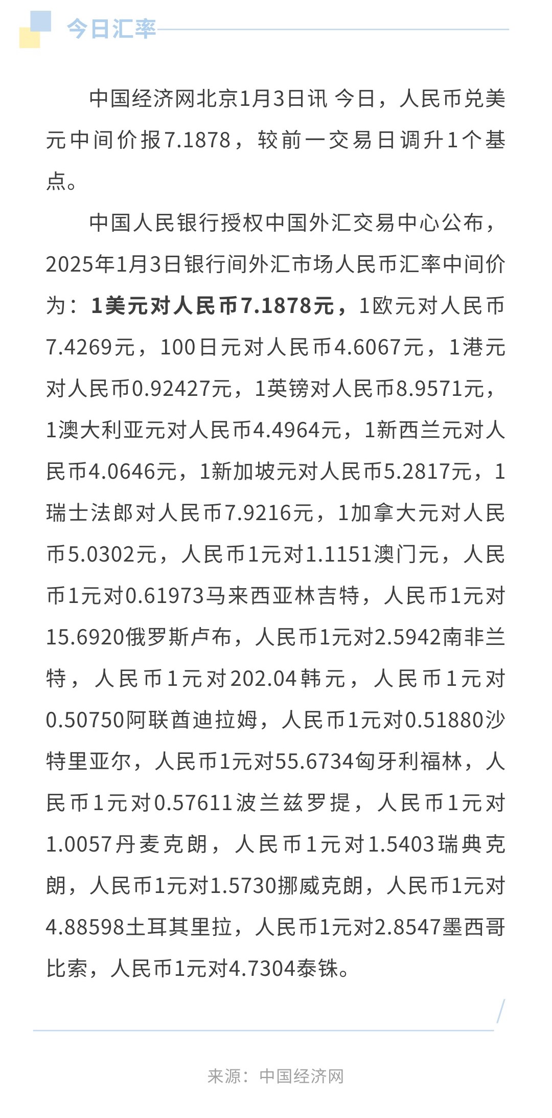 1月3日人民币兑美元中间价报7.1878,调升1个基点