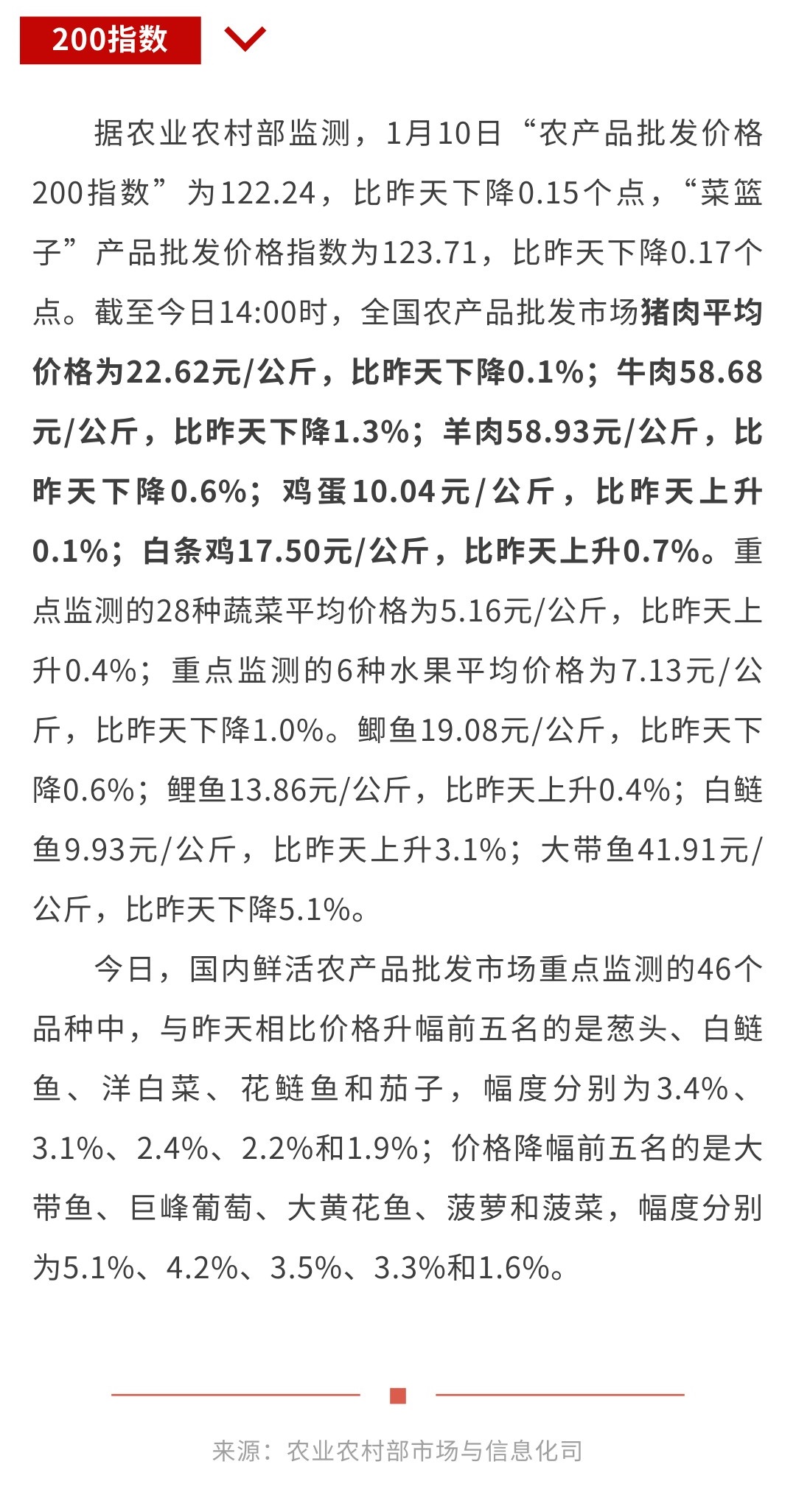 1月10日“农产品批发价格200指数”比昨天下降0.15个点