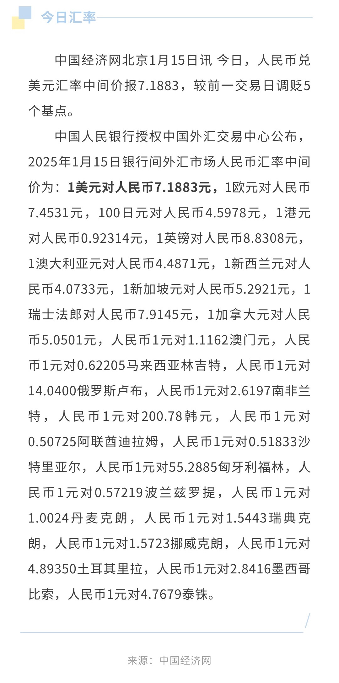 1月15日人民币兑美元中间价报7.1883,调贬5个基点