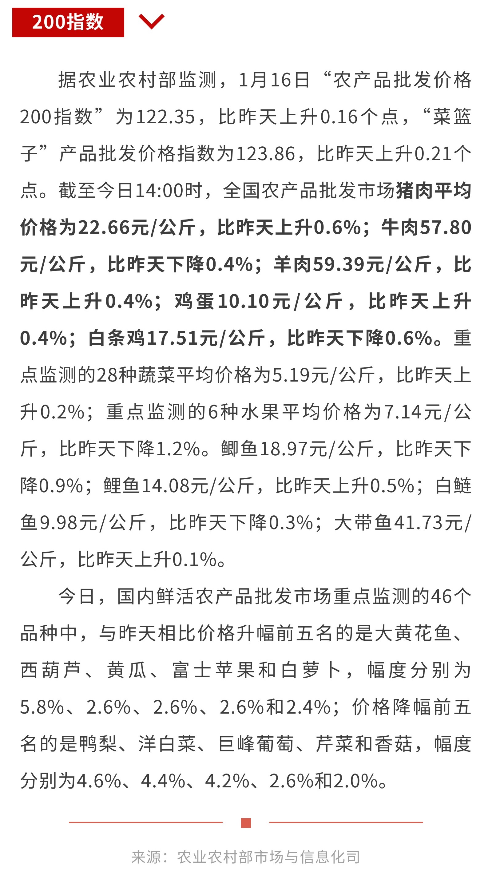1月16日“农产品批发价格200指数”比昨天上升0.16个点