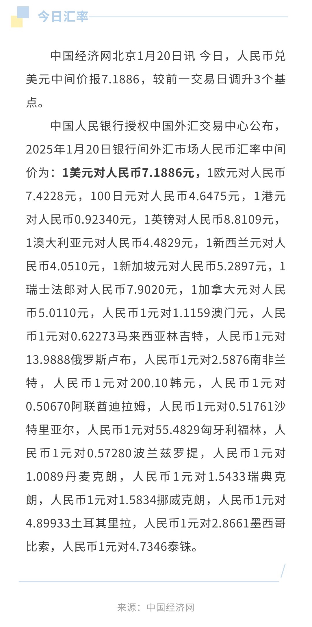 1月20日人民币兑美元中间价报7.1886,调升3个基点