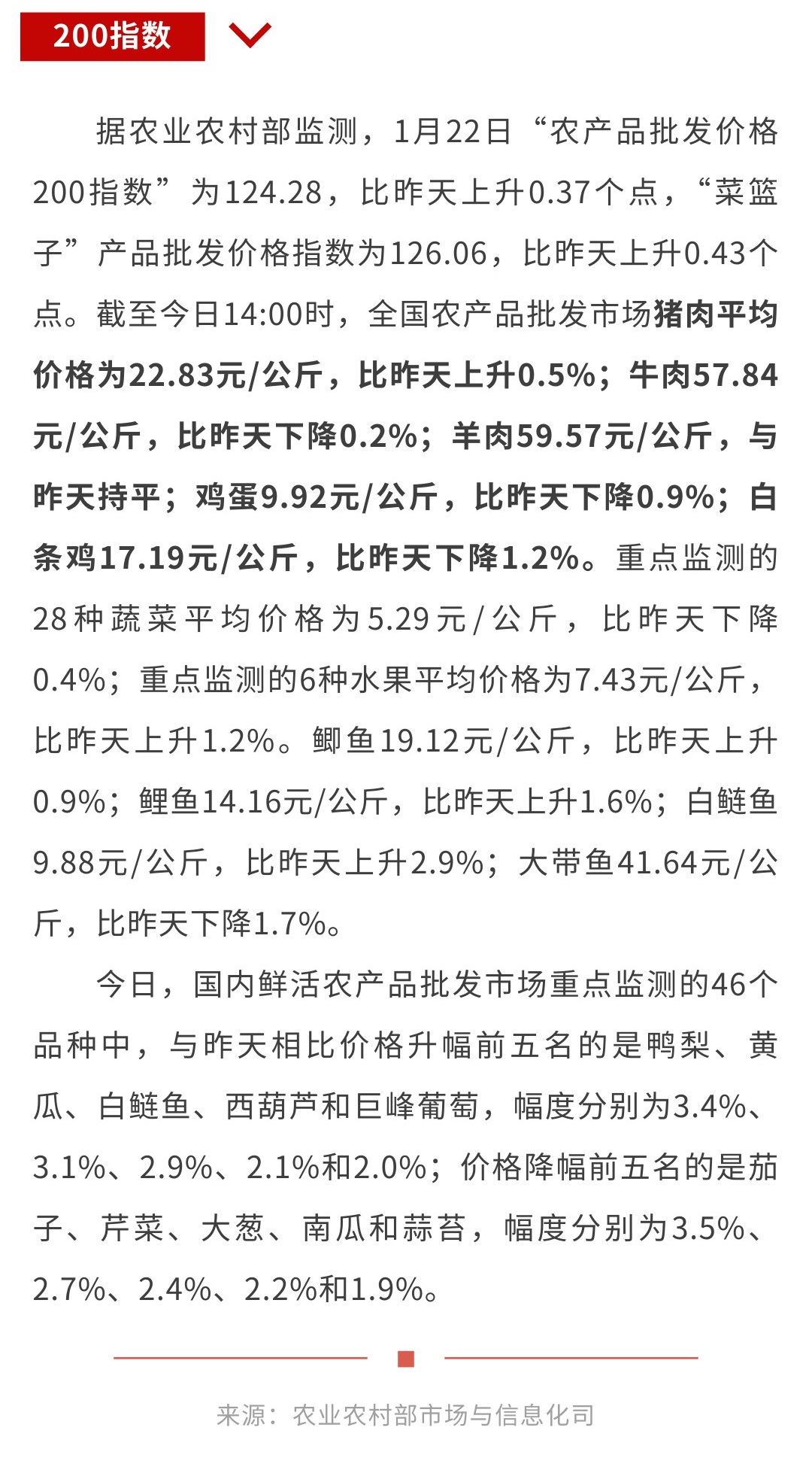 1月22日“农产品批发价格200指数”比昨天上升0.37个点
