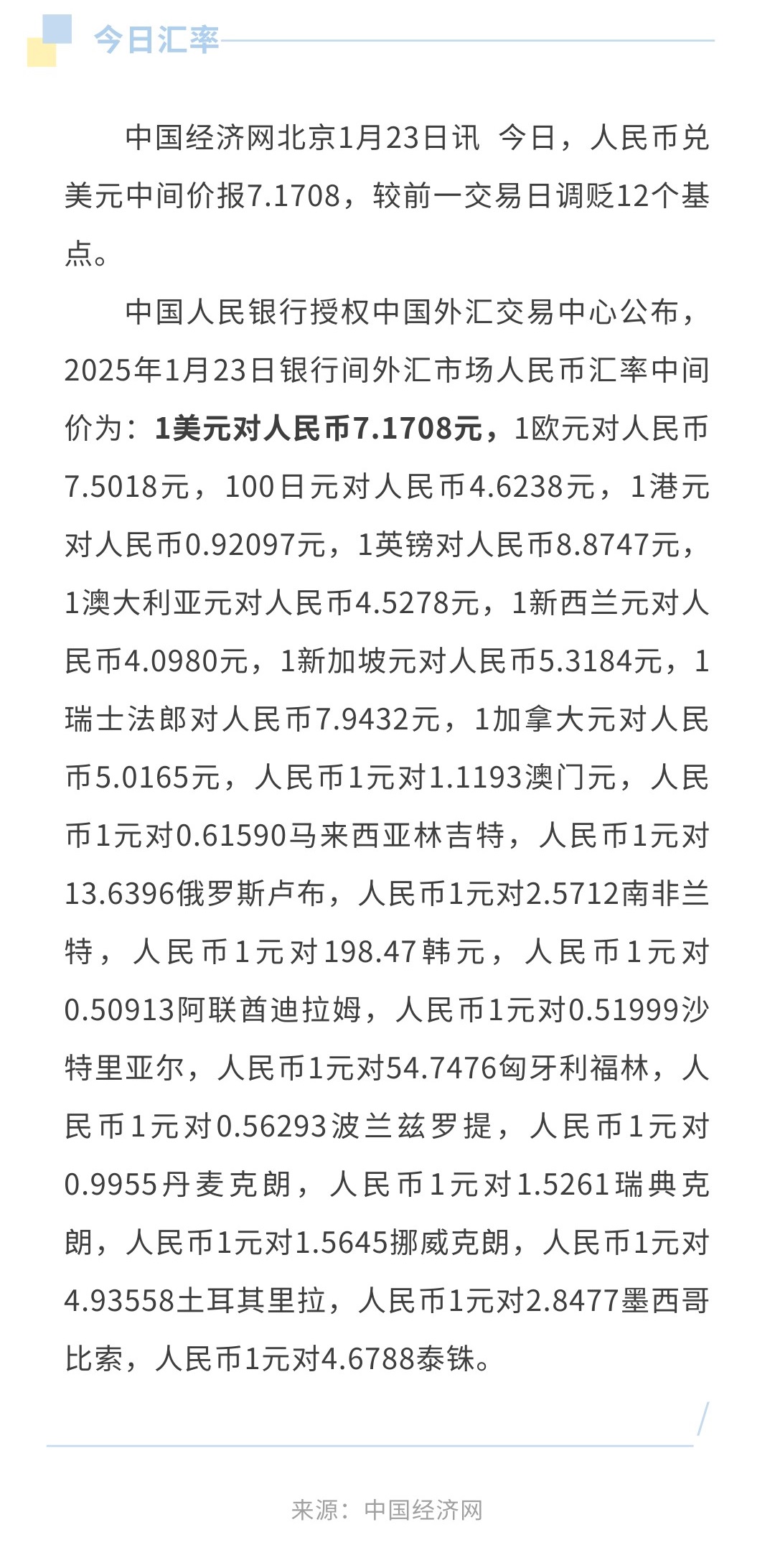 1月23日人民币兑美元中间价报7.1708,调贬12个基点