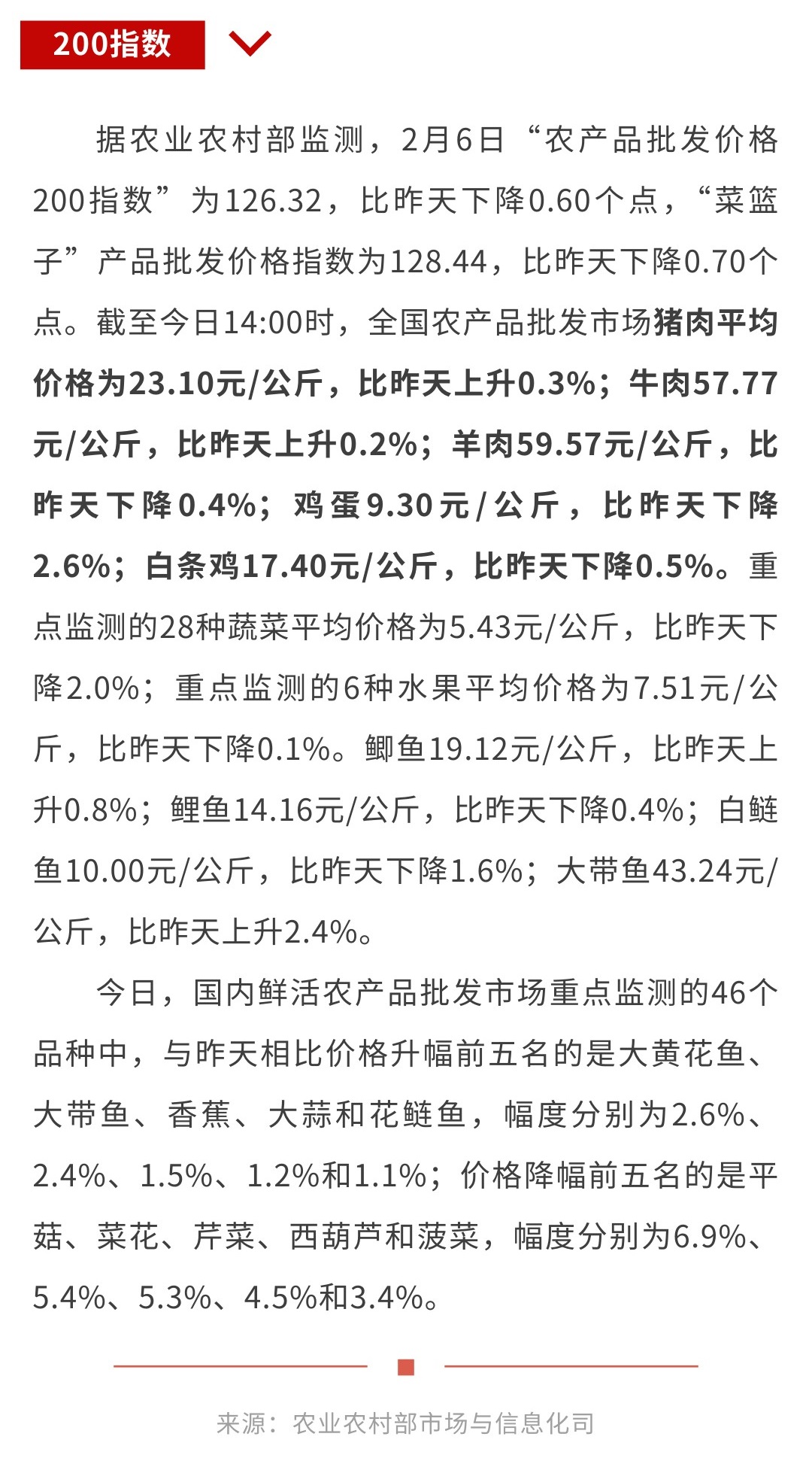 2月6日“农产品批发价格200指数”比昨天下降0.60个点