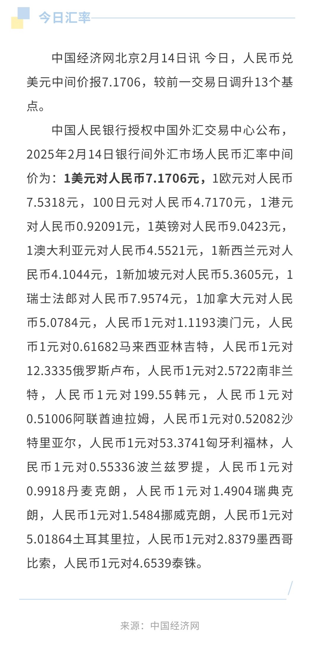2月14日人民币兑美元中间价报7.1706,调升13个基点