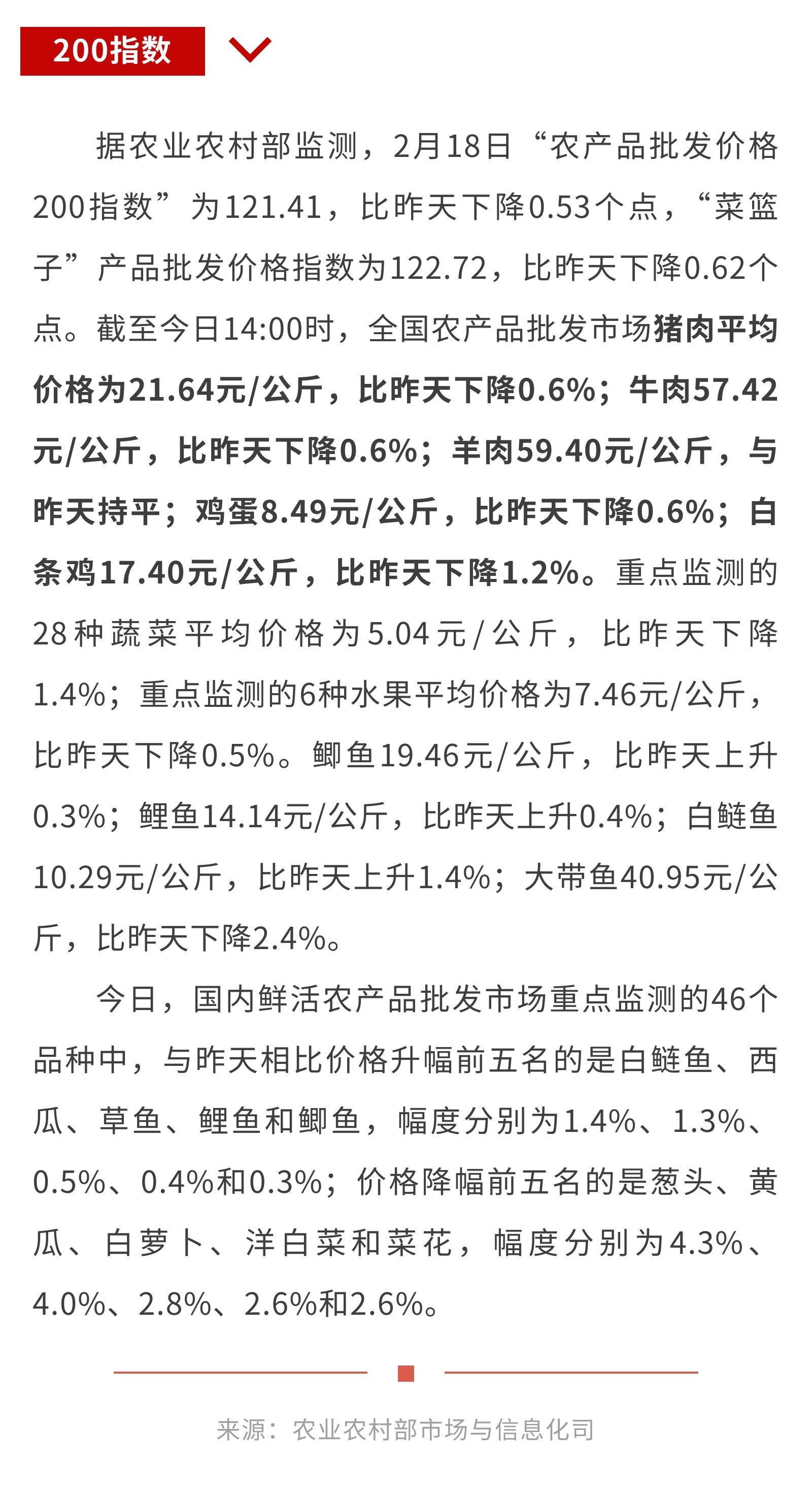 2月18日“农产品批发价格200指数”比昨天下降0.53个点