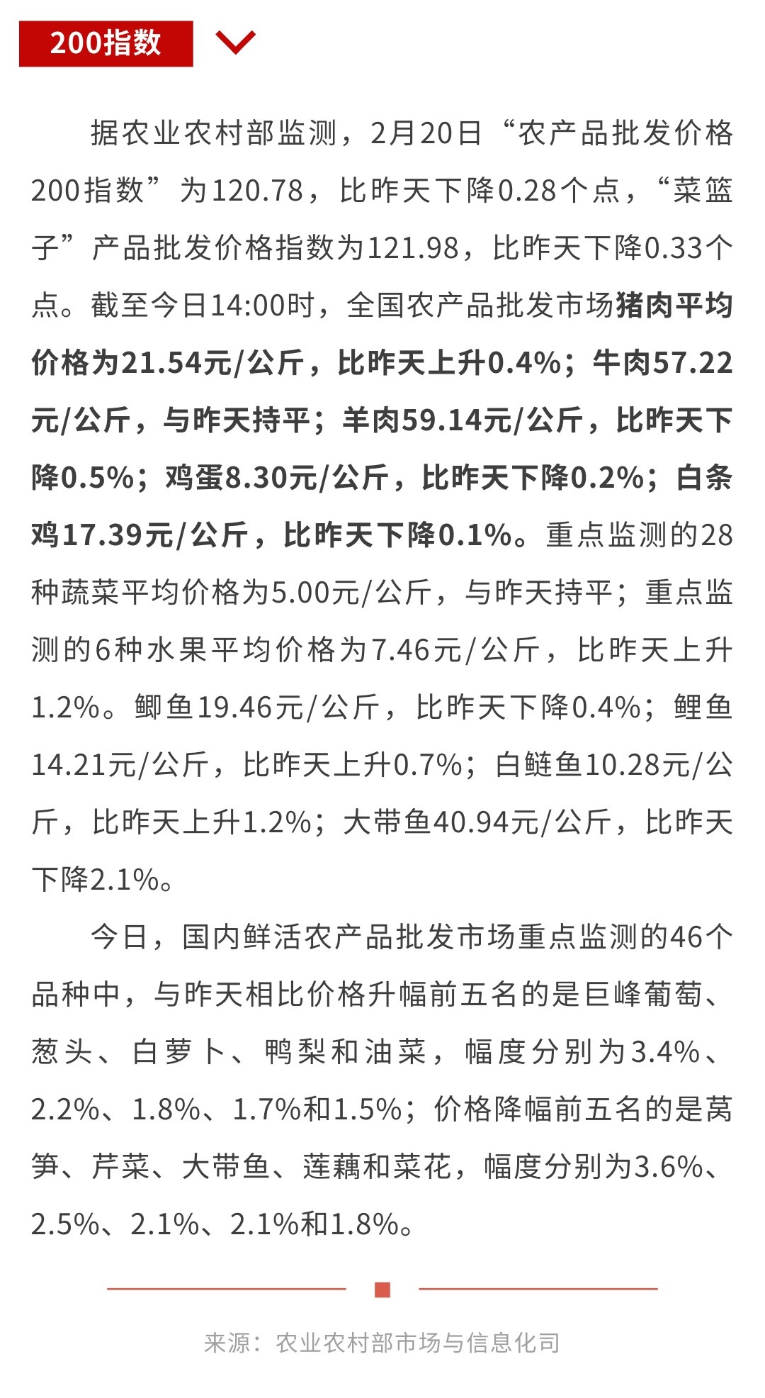 2月20日“农产品批发价格200指数”比昨天下降0.28个点