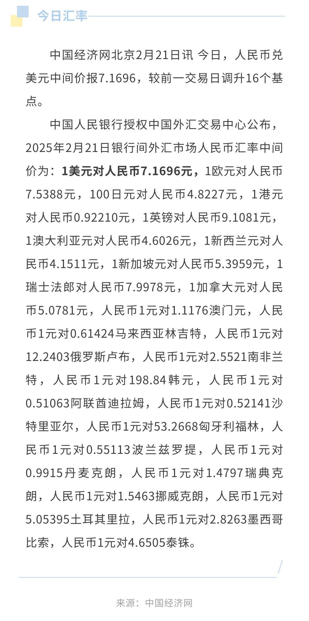 2月21日人民币兑美元中间价报7.1696,调升16个基点