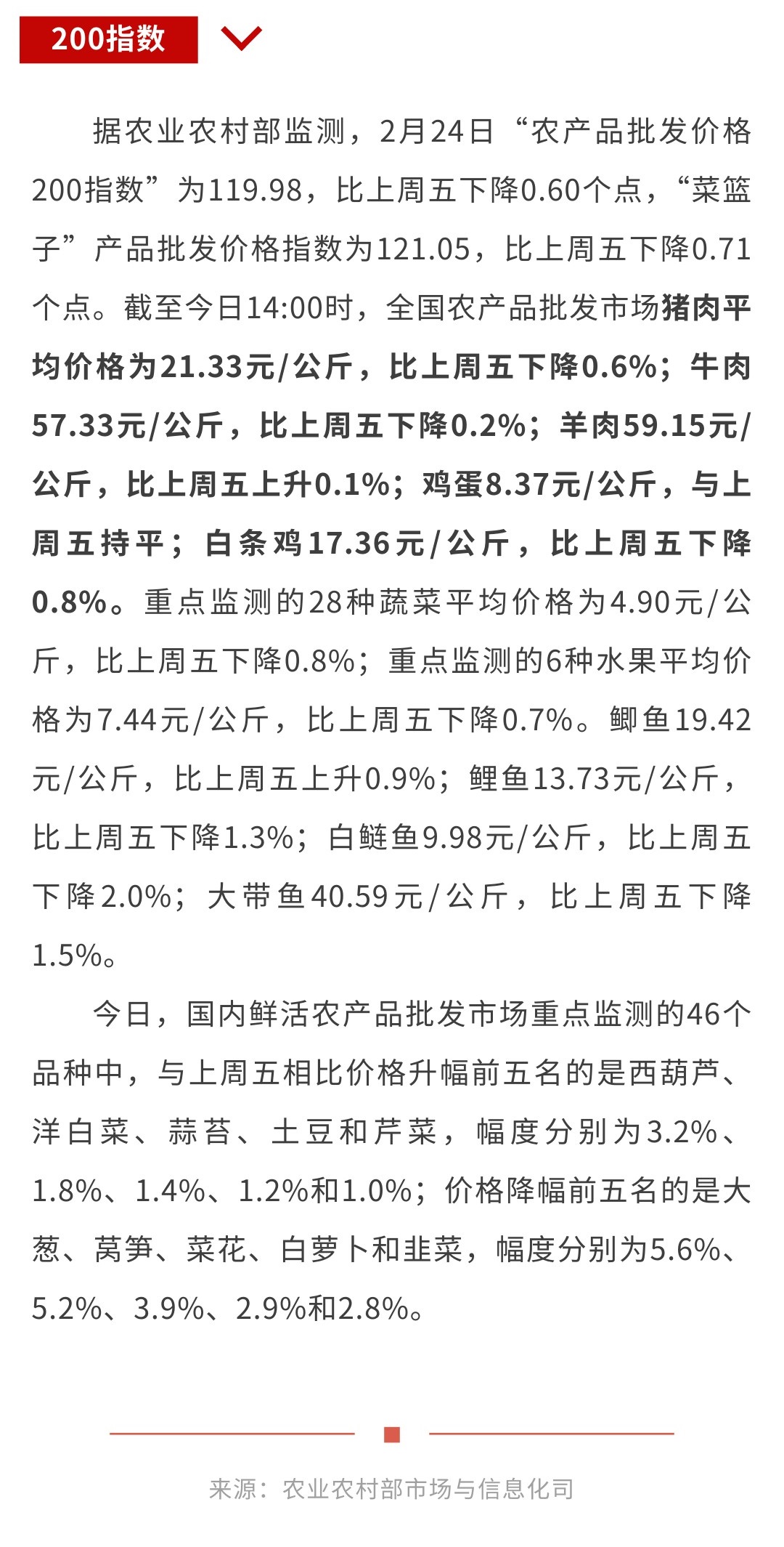 2月24日“农产品批发价格200指数”比上周五下降0.60个点