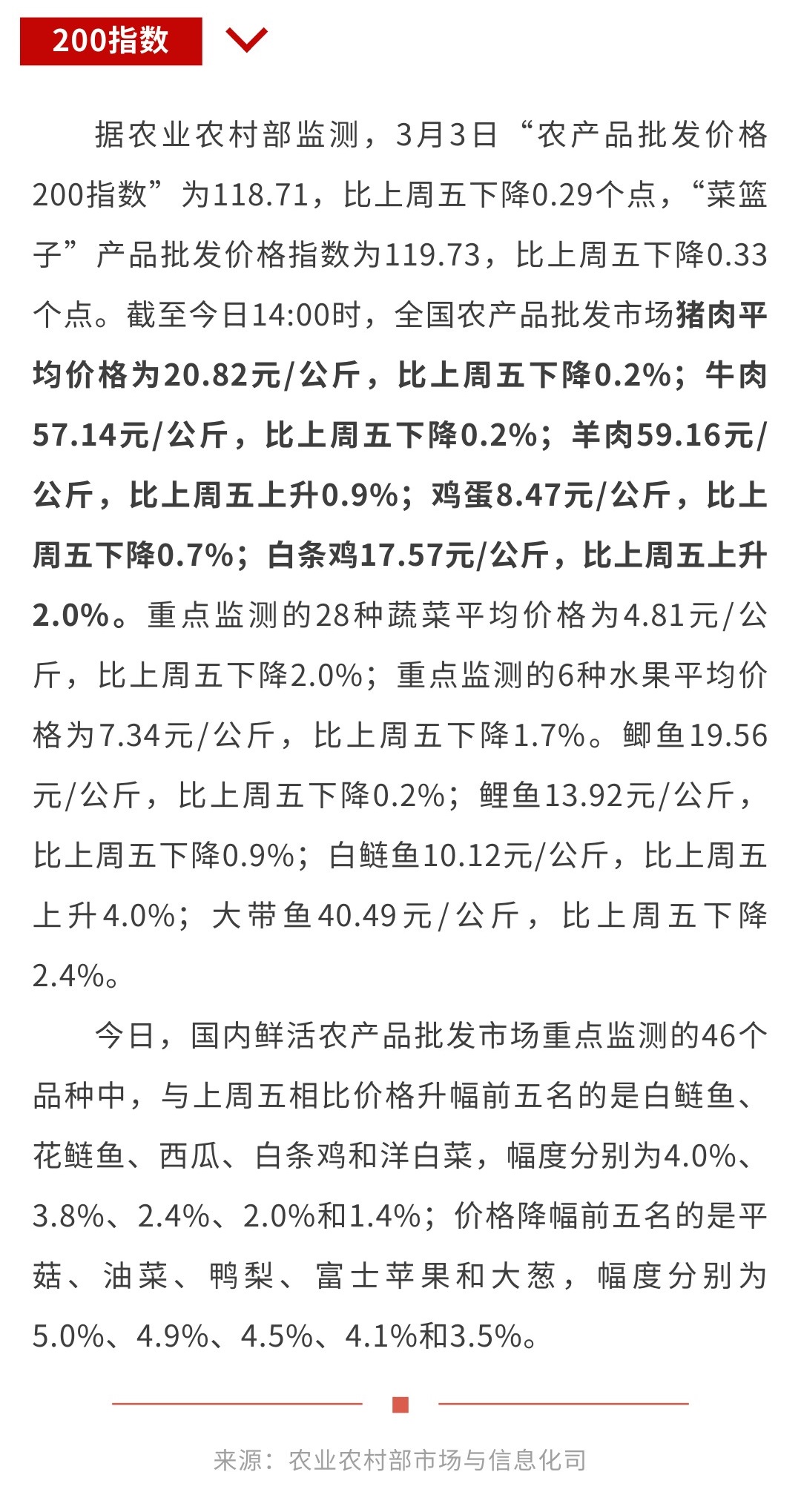3月3日“农产品批发价格200指数”比上周五下降0.29个点