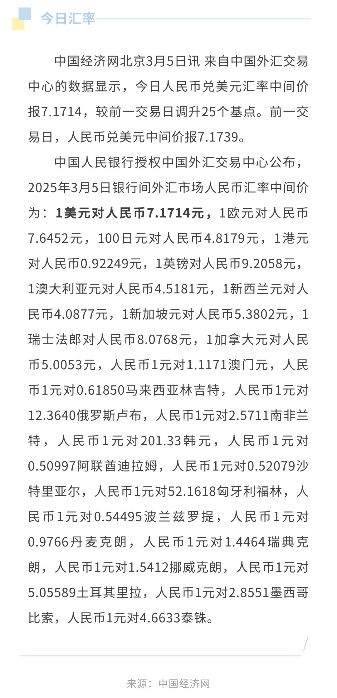 3月5日人民币兑美元中间价报7.1714,调升25个基点