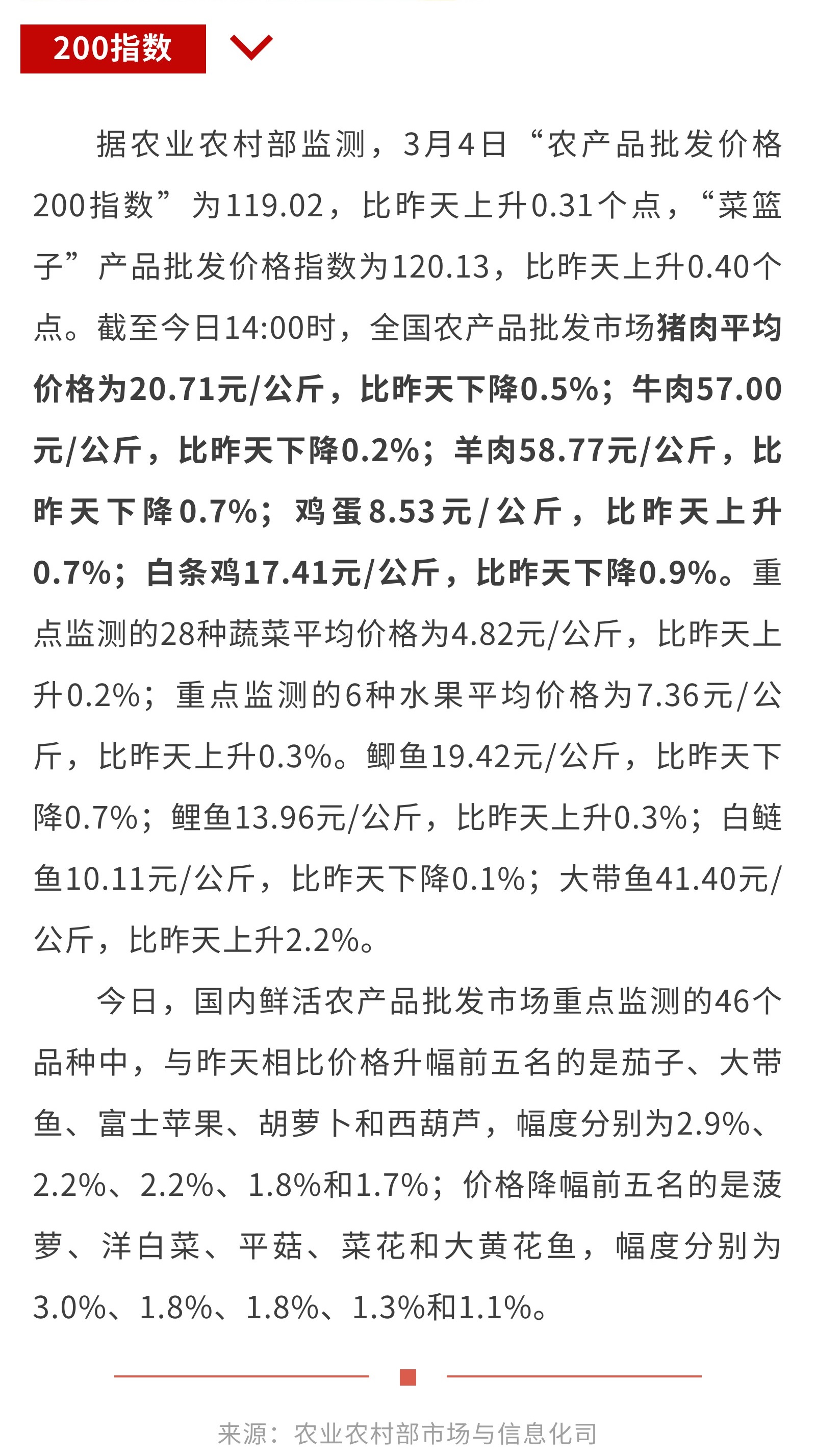 3月4日“农产品批发价格200指数”比昨天上升0.31个点