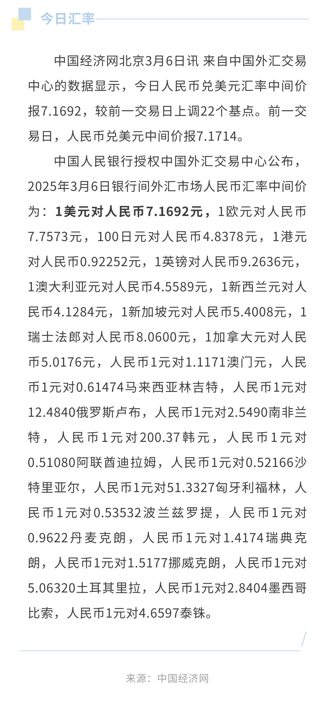 3月6日人民币兑美元中间价报7.1692,上调22个基点