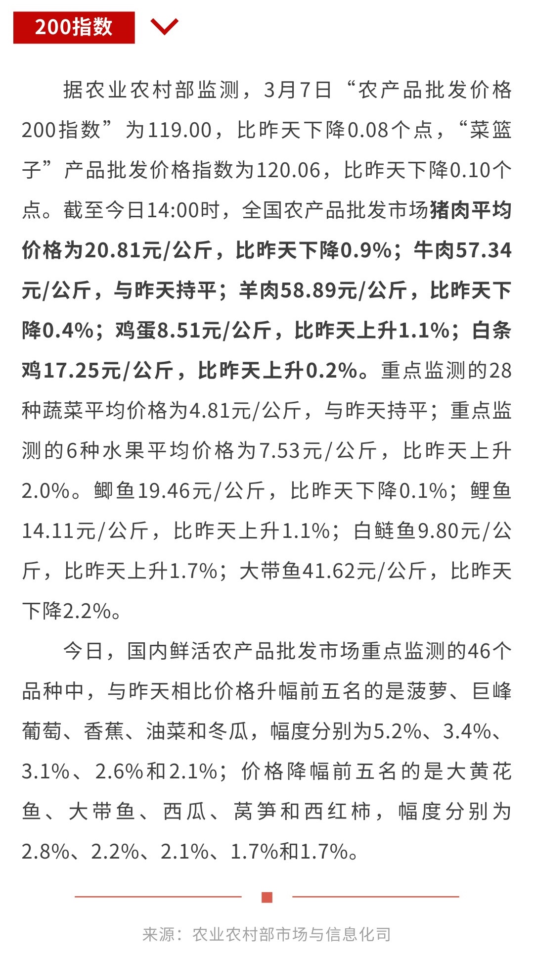 3月7日“农产品批发价格200指数”比昨天下降0.08个点