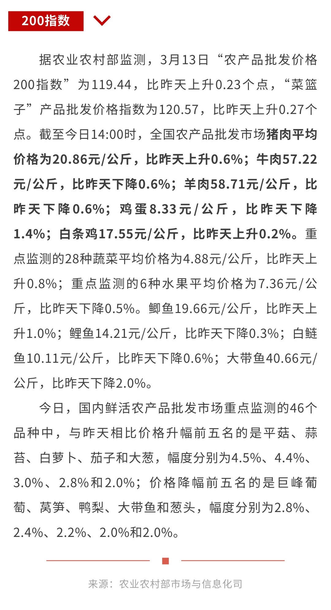 3月13日“农产品批发价格200指数”比昨天上升0.23个点