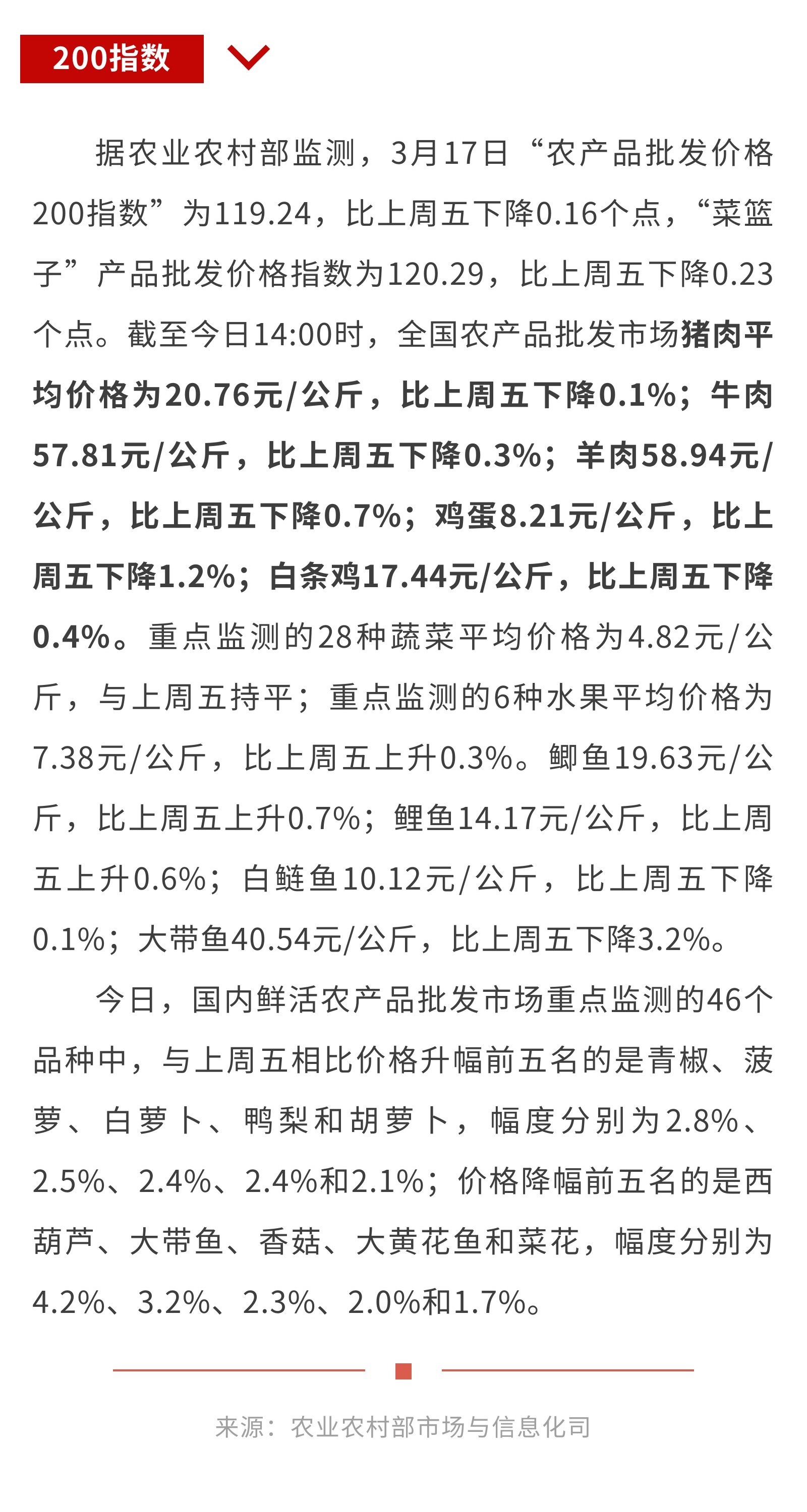 3月17日“农产品批发价格200指数”比上周五下降0.16个点
