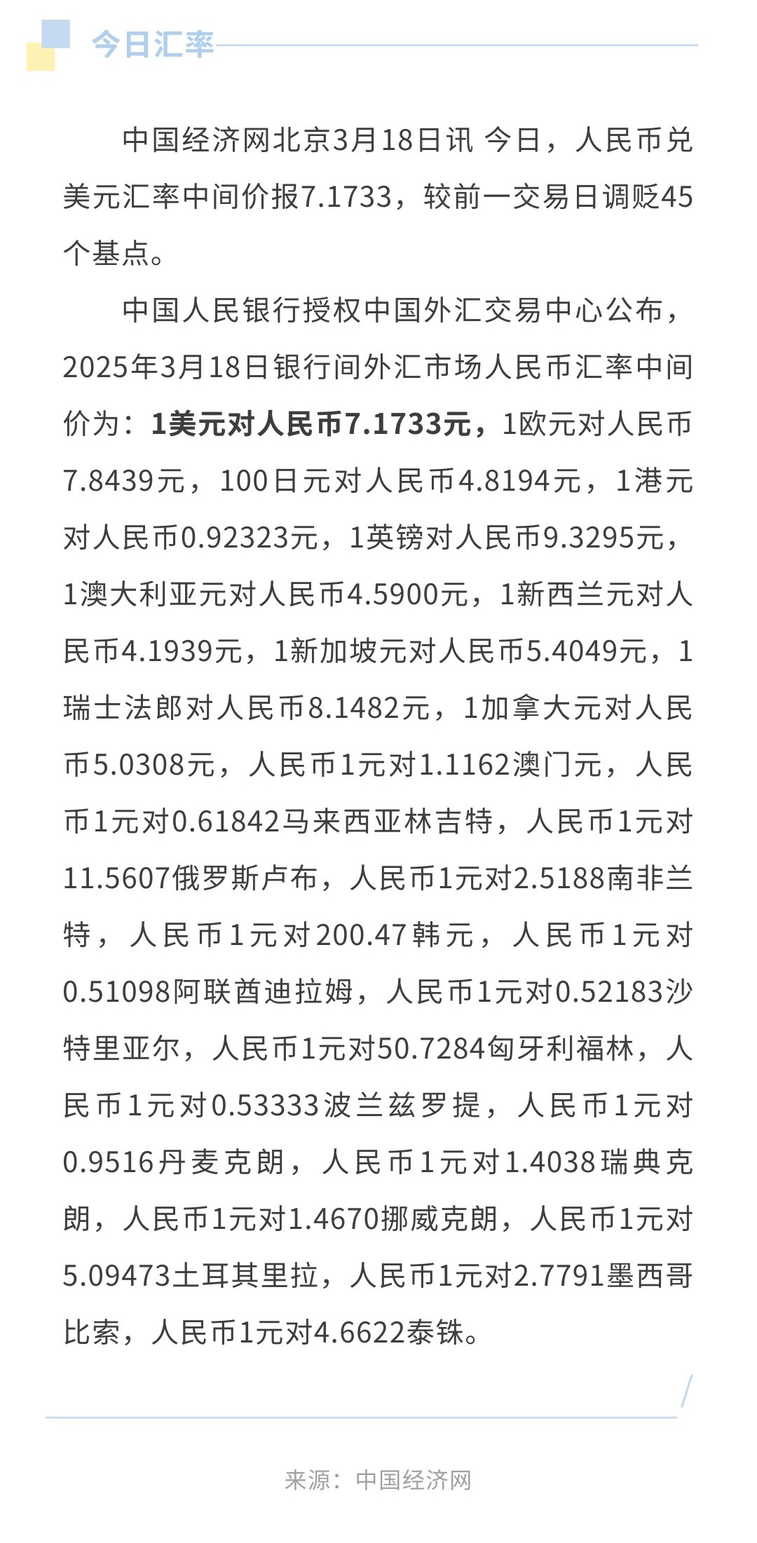 3月18日人民币兑美元中间价报7.1733,调贬45个基点