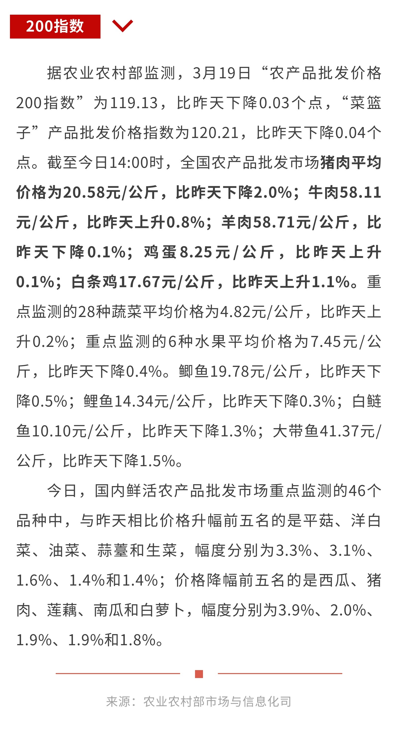 3月19日“农产品批发价格200指数”比昨天下降0.03个点