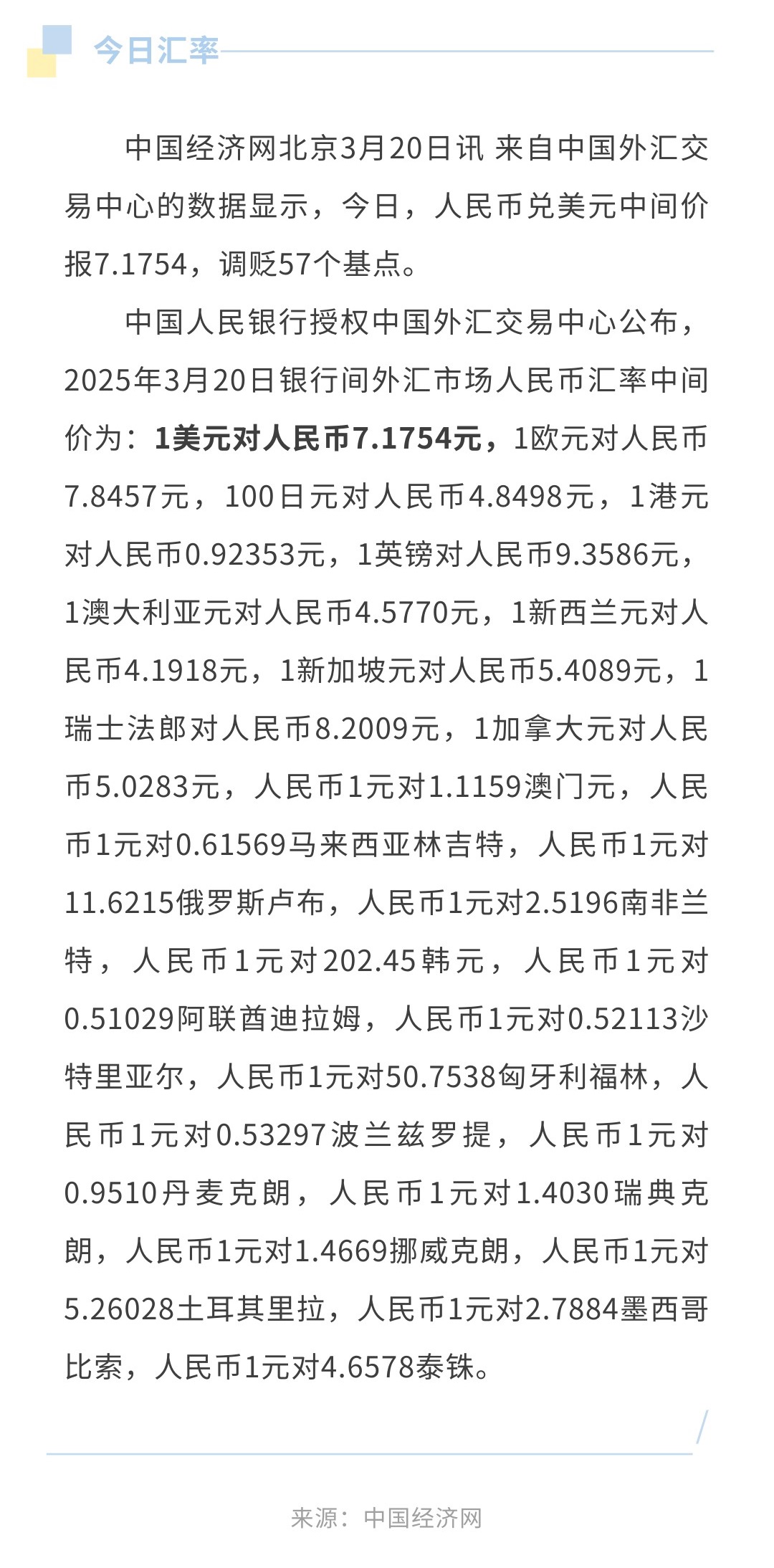 3月20日人民币兑美元中间价报7.1754,调贬57个基点