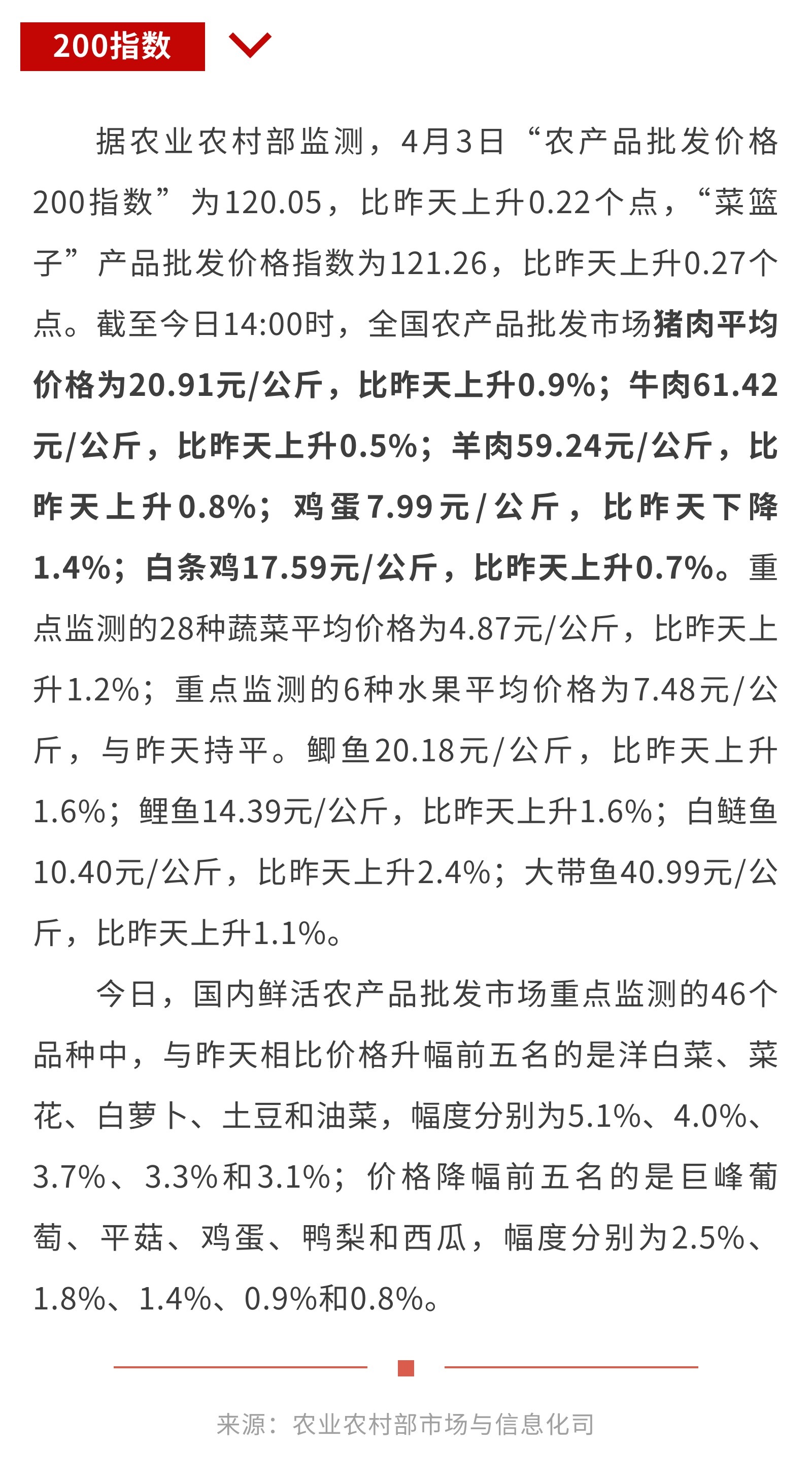 4月3日“农产品批发价格200指数”比昨天上升0.22个点