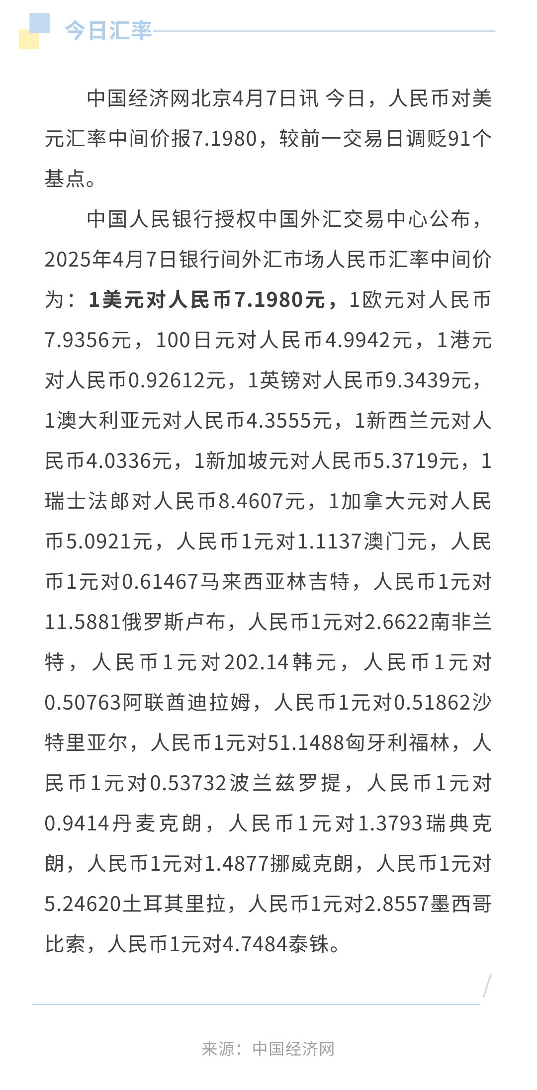 4月7日人民币兑美元中间价报7.1980,调贬91个基点