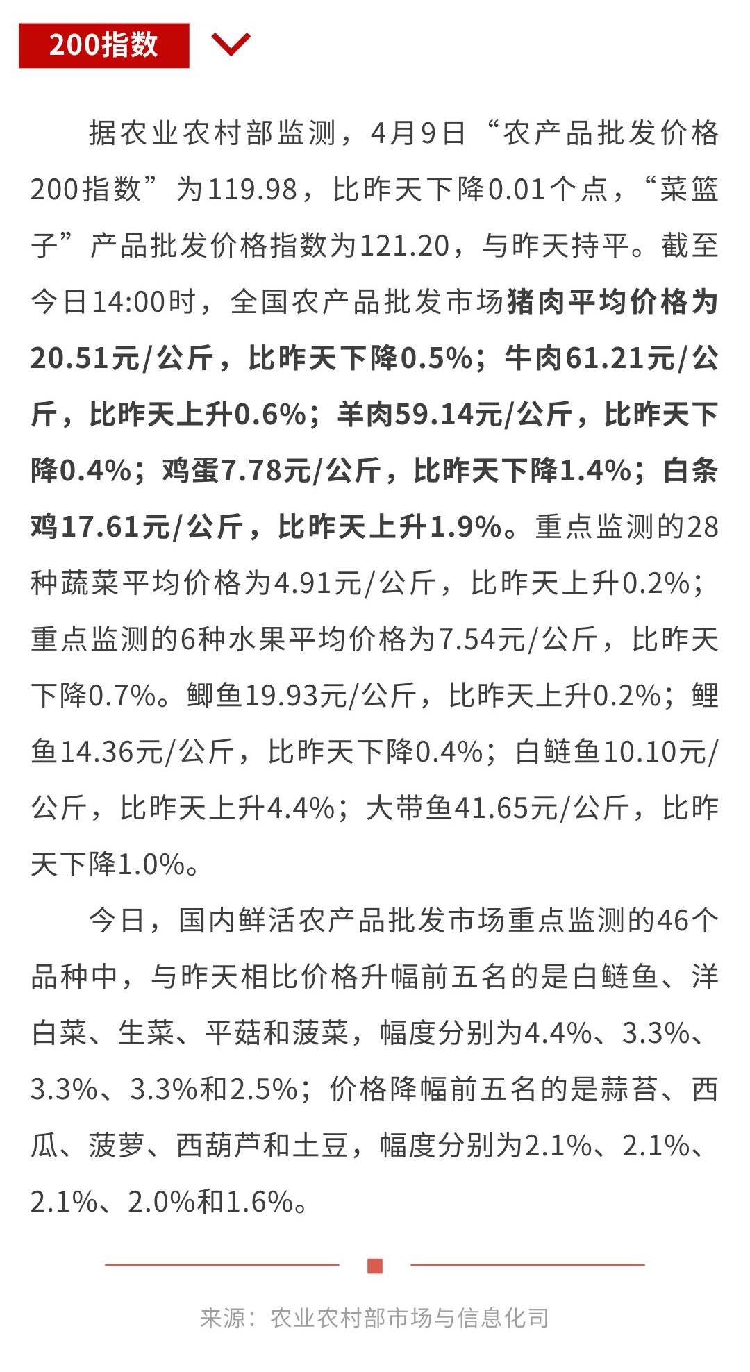 4月9日“农产品批发价格200指数”比昨天下降0.01个点