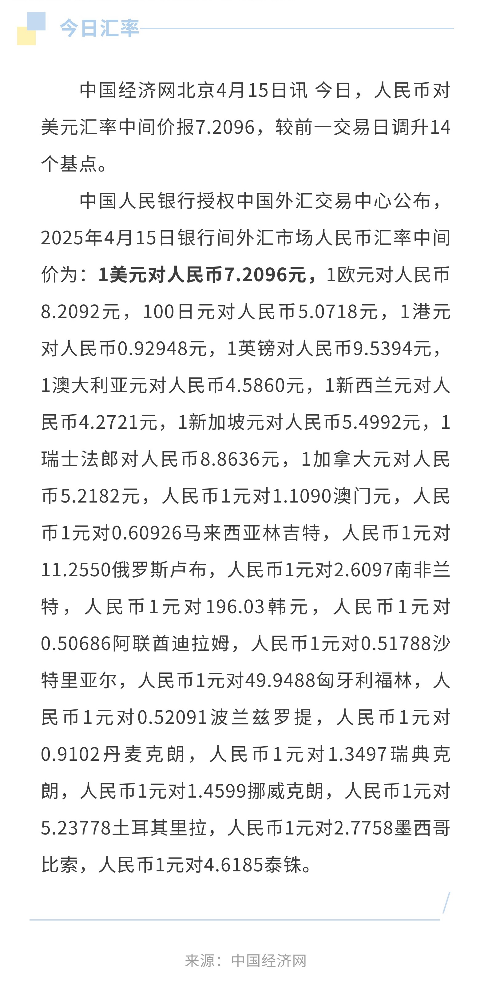 4月15日人民币兑美元中间价报7.2096,调升14个基点