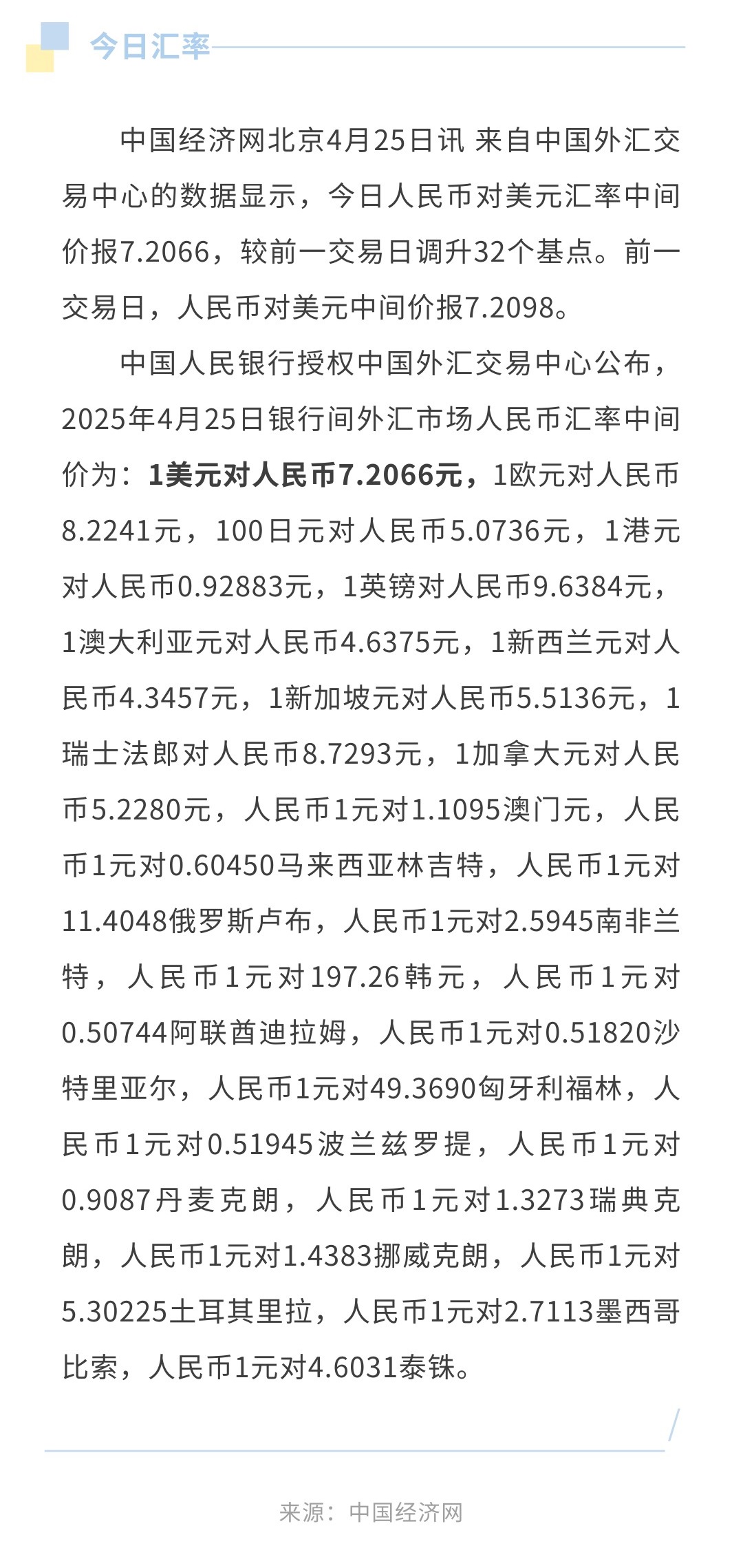 4月25日人民币兑美元中间价报7.2066,调升32个基点